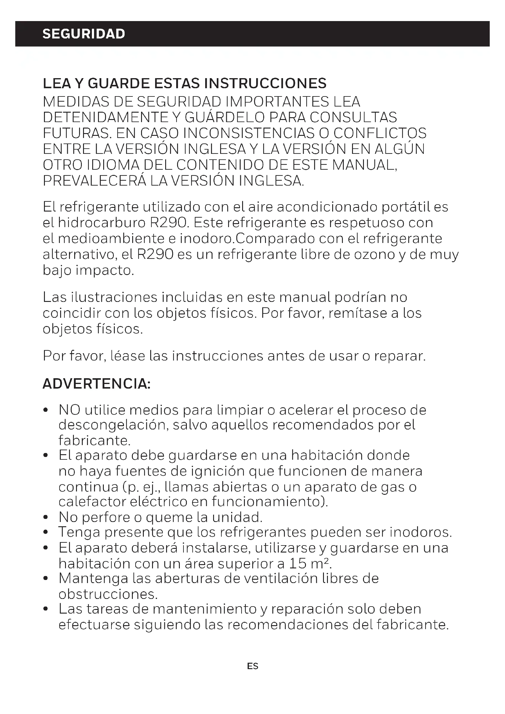 NO utilice medios para limpiar o acelerar el proceso de descongelación, salvo aquellos recomendados por el fabricante. El aparato debe guardarse en una habitación donde no haya fuentes de ignición que funcionen de manera continua (p. ej., llamas abiertas o un aparato de gas o calefactor eléctrico en funcionamiento). No perfore o queme la unidad. Tenga presente que los refrigerantes pueden ser inodoros. El aparato deberá instalarse, utilizarse y guardarse en una habitación con un área superior a 15 m². Mantenga las aberturas de ventilación libres de obstrucciones. Las tareas de mantenimiento y reparación solo deben efectuarse siguiendo las recomendaciones del fabricante. ESSEGURIDAD (CONTINUACIÓN) Este aparato debe utilizarse en una habitación que permitauna buena ventilación entre éste y las paredes, los muebles y demás objetos. El tamaño de la habitación debe corresponderse con el área de uso especificada por el fabricante. El aparato también debe mantenerse en buen estado para prevenir daños mecánicos. Cualquier persona que trabaje o acceda a circuitos de refrigeración deberá poseer un certificado válido vigente de una autoridad de evaluación acreditada en la industria correspondiente que homologue su competencia para manipular refrigerantes de manera segura y conforme a una especificación de evaluación reconocida por dicha industria. Solo deberán trabajar en circuitos de refrigeración personas autorizadas por una agencia acreditada que certifique su competencia para manipular refrigerantes cumpliendo con la normativa del sector. El mantenimiento y las reparaciones que requieran la asistencia de algún otro personal acreditado deberán realizarse bajo la supervisión de especialistas en el uso de refrigerantes inflamables. Cualquier procedimiento que afecte la seguridad solo deberán llevarlo a cabo personas competentes. Este aparato no puede ser utilizado por niños a o personas con minusvalías físicas, sensoriales o mentales, o que no cuenten con suficiente experiencia o conocimientos, salvo que sean supervisados o hayan sido instruidos en el uso apropiado y seguro del aparato y entiendan los peligros que acarrea.Los niños no deben jugar con el aparato. Las tareas de limpieza y mantenimiento no podrán ser realizadas por niños sin supervisión. Siga el reglamento de conexión de la red local cuando instale el aire acondicionado y asegúrese de que esté debidamente conectado a tierra. Si tiene alguna duda sobre la instalación eléctrica, siga las instrucciones del fabricante y, si es necesario, solicite a un electricista profesional llevar a cabo la instalación.