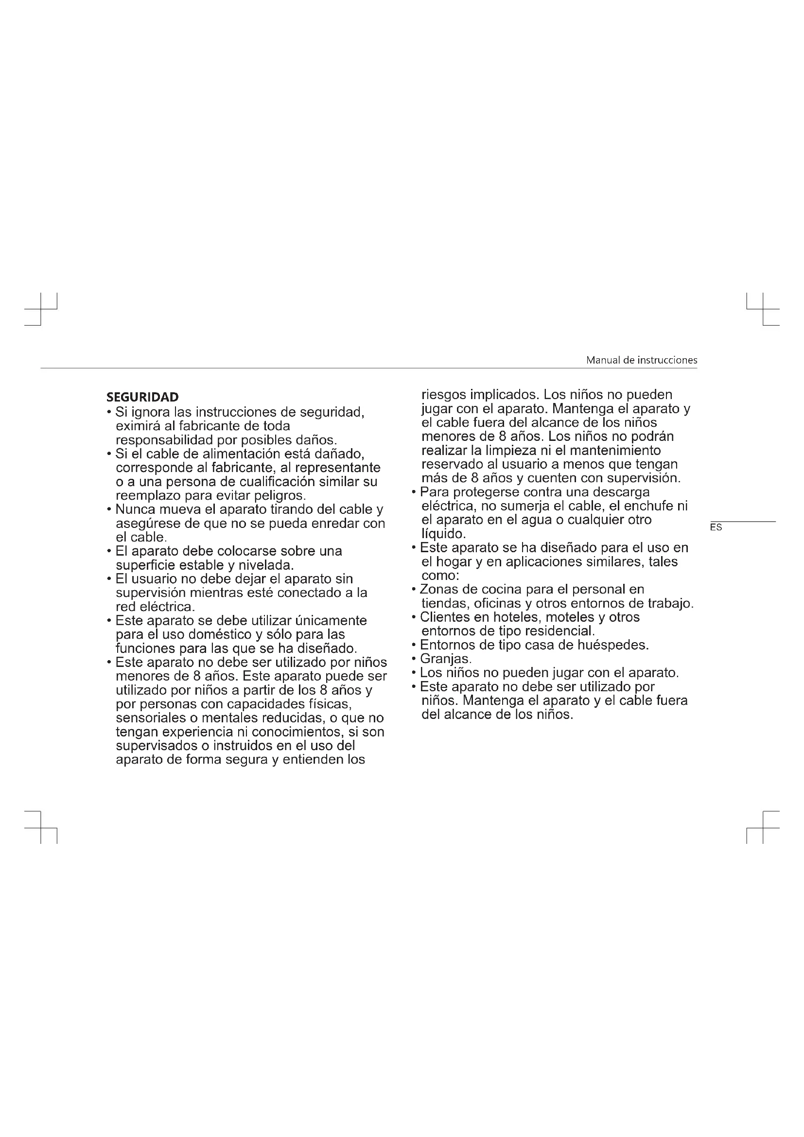 - Este aparato no debe ser utilizado por niños. Mantenga el aparato y el cable fuera del alcance de los niños. ESManual de instrucciones