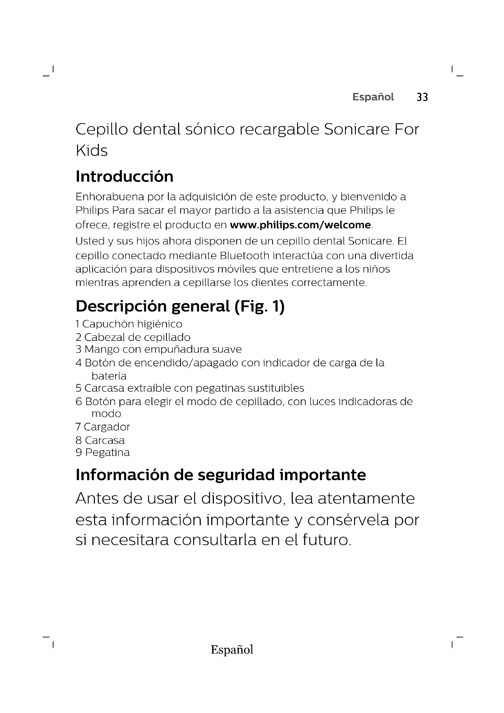 DeutschEspañol Cepillo dental sónico recargable Sonicare For Kids Introducción Enhorabuena por la adquisición de este producto, y bienvenido a Philips Para sacar el mayor partido a la asistencia que Philips le ofrece, registre el producto en www.philips.com/welcome. Usted y sus hijos ahora disponen de un cepillo dental Sonicare. El cepillo conectado mediante Bluetooth interactúa con una divertida aplicación para dispositivos móviles que entretiene a los niños mientras aprenden a cepillarse los dientes correctamente. Descripción general (Fig. 1) 1 Capuchón higiénico 2 Cabezal de cepillado 3 Mango con empuñadura suave 4 Botón de encendido/apagado con indicador de carga de la batería 5 Carcasa extraíble con pegatinas sustituibles 6 Botón para elegir el modo de cepillado, con luces indicadoras de modo 7 Cargador 8 Carcasa 9 Pegatina Información de seguridad importante Antes de usar el dispositivo, lea atentamente esta información importante y consérvela por si necesitara consultarla en el futuro.