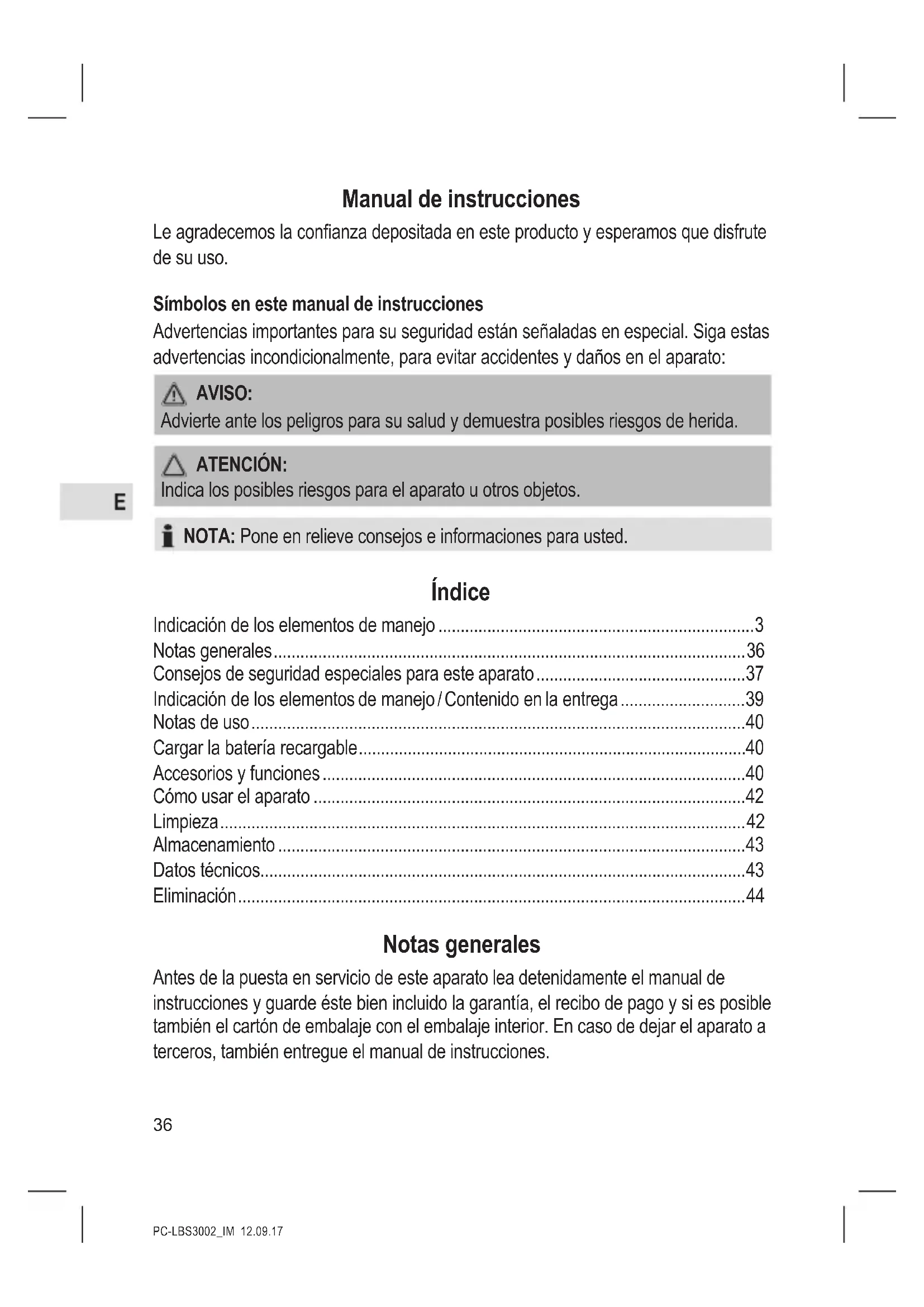 - Eliminación Notas generales Antes de la puesta en servicio de este aparato lea detenidamente el manual de instrucciones y guarde éste bien incluido la garantía, el recibo de pago y si es posible también el cartón de embalaje con el embalaje interior. En caso de dejar el aparato a terceros, también entregue el manual de instrucciones.PC-LBS3002_IM 12.09.17 p. 44