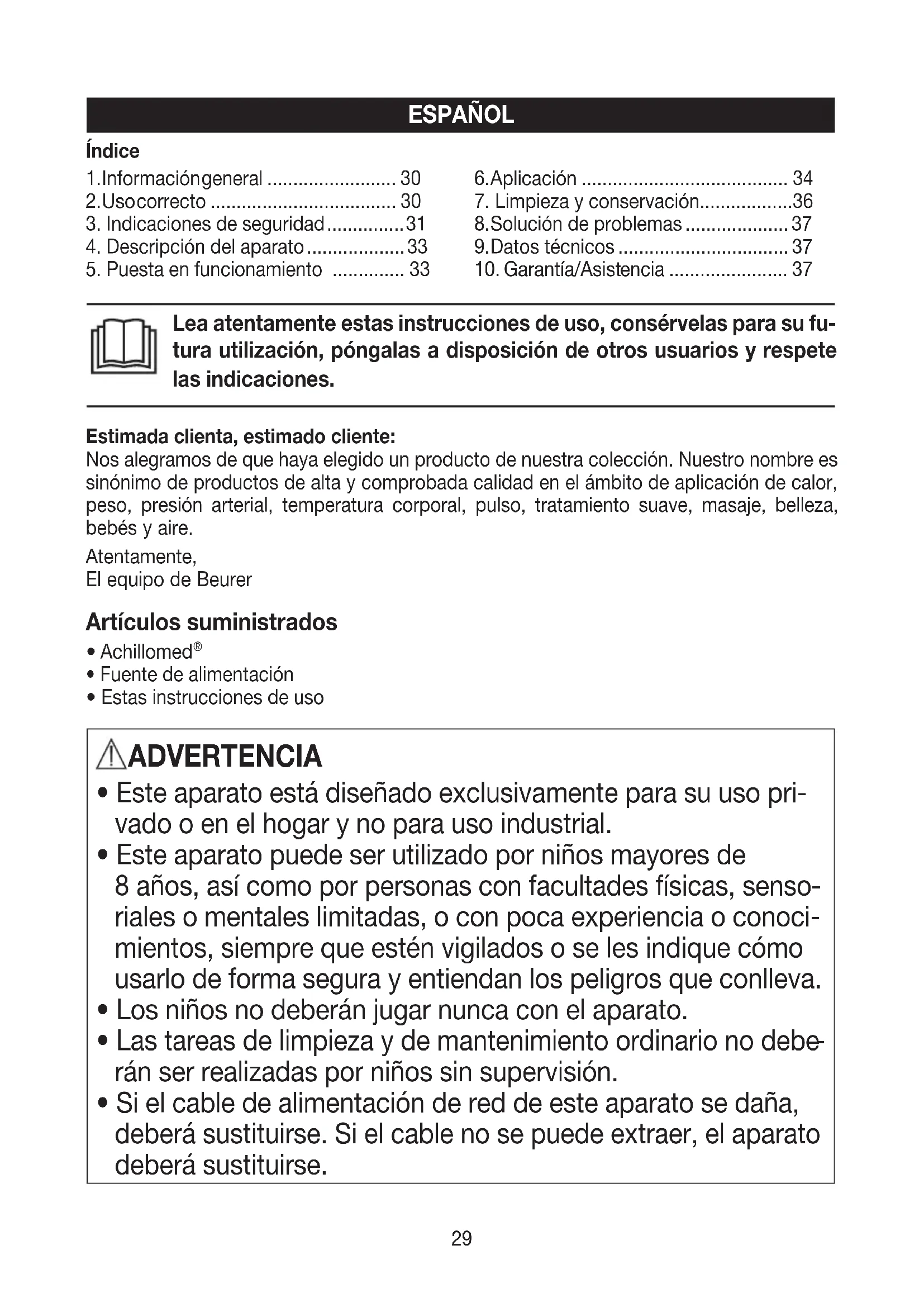 l‘appareil est exclue même si un droit de garantie est reconnu en cas de dommage à l‘appareil. Sous réserve d’erreurs et de modifications29 Lea atentamente estas instrucciones de uso, consérvelas para su fu- tura utilización, póngalas a disposición de otros usuarios y respete las indicaciones. Estimada clienta, estimado cliente: Nos alegramos de que haya elegido un producto de nuestra colección. Nuestro nombre es sinónimo de productos de alta y comprobada calidad en el ámbito de aplicación de calor, peso, presión arterial, temperatura corporal, pulso, tratamiento suave, masaje, belleza, bebés y aire. Atentamente, El equipo de Beurer Artículos suministrados