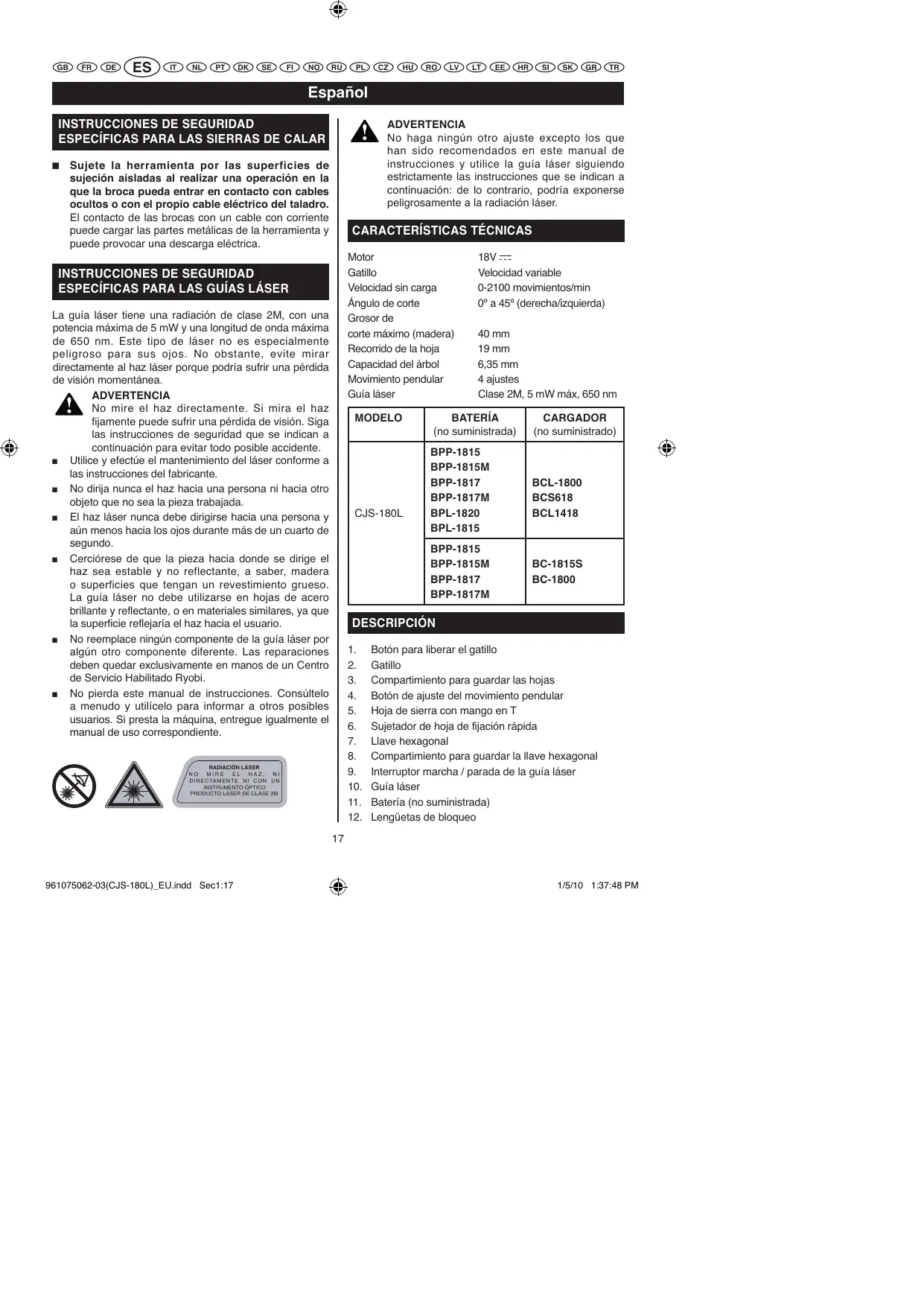 ESPECÍFICAS PARA LAS GUÍAS LÁSER La guía láser tiene una radiación de clase 2M, con una potencia máxima de 5 mW y una longitud de onda máxima de 650 nm. Este tipo de láser no es especialmente peligroso para sus ojos. No obstante, evite mirar directamente al haz láser porque podría sufrir una pérdida de visión momentánea. ADVERTENCIA No mire el haz directamente. Si mira el haz fijamente puede sufrir una pérdida de visión. Siga las instrucciones de seguridad que se indican a continuación para evitar todo posible accidente. Utilice y efectúe el mantenimiento del láser conforme a las instrucciones del fabricante. No dirija nunca el haz hacia una persona ni hacia otro objeto que no sea la pieza trabajada. El haz láser nunca debe dirigirse hacia una persona y aún menos hacia los ojos durante más de un cuarto de segundo. Cerciórese de que la pieza hacia donde se dirige el haz sea estable y no reflectante, a saber, madera o superficies que tengan un revestimiento grueso. La guía láser no debe utilizarse en hojas de acero brillante y reflectante, o en materiales similares, ya que la superficie reflejaría el haz hacia el usuario. No reemplace ningún componente de la guía láser por algún otro componente diferente. Las reparaciones deben quedar exclusivamente en manos de un Centro de Servicio Habilitado Ryobi. No pierda este manual de instrucciones. Consúltelo a menudo y utilícelo para informar a otros posibles usuarios. Si presta la máquina, entregue igualmente el manual de uso correspondiente. MODELO CJS-180L 18V Velocidad variable 0-2100 movimientos/min 0º a 45º (derecha/izquierda) 40 mm 19 mm 6,35 mm 4 ajustes Clase 2M, 5 mW máx, 650 nm CARGADOR (no suministrado) BCL-1800 BCS618 BCL1418 BC-1815S BC-1800 DESCRIPCIÓN