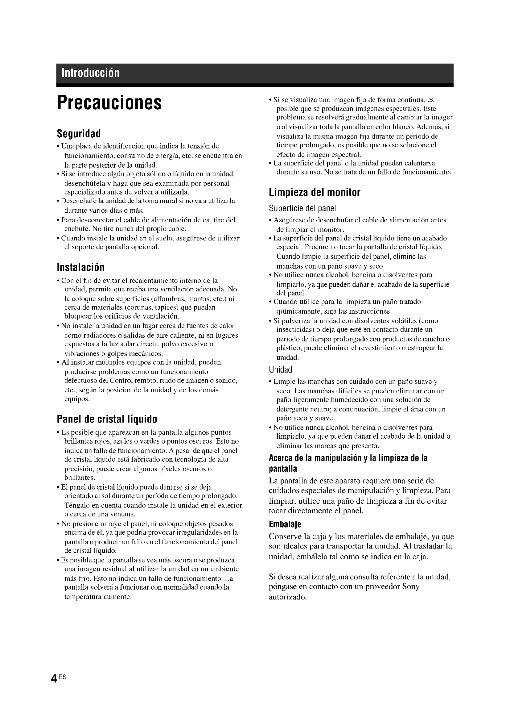 - No utilice nunca alcohol, bencina o disolventes para limpiarlo, ya que pueden dañar el acabado de la unidad o eliminar las marcas que presenta. Acerca de la manipulación y la limpieza de la pantalla La pantalla de este aparato requiere una serie de cuidados especiales de manipulación y limpieza. Para limpiar, utilice una paño de limpieza a fin de evitar tocar directamente el panel. Embalaje Conserve la caja y los materiales de embalaje, ya que son ideales para transportar la unidad. Al trasladar la unidad, embálela tal como se indica en la caja. Si desea realizar alguna consulta referente a la unidad, póngase en contacto con un proveedor Sony autorizado. Introducción5