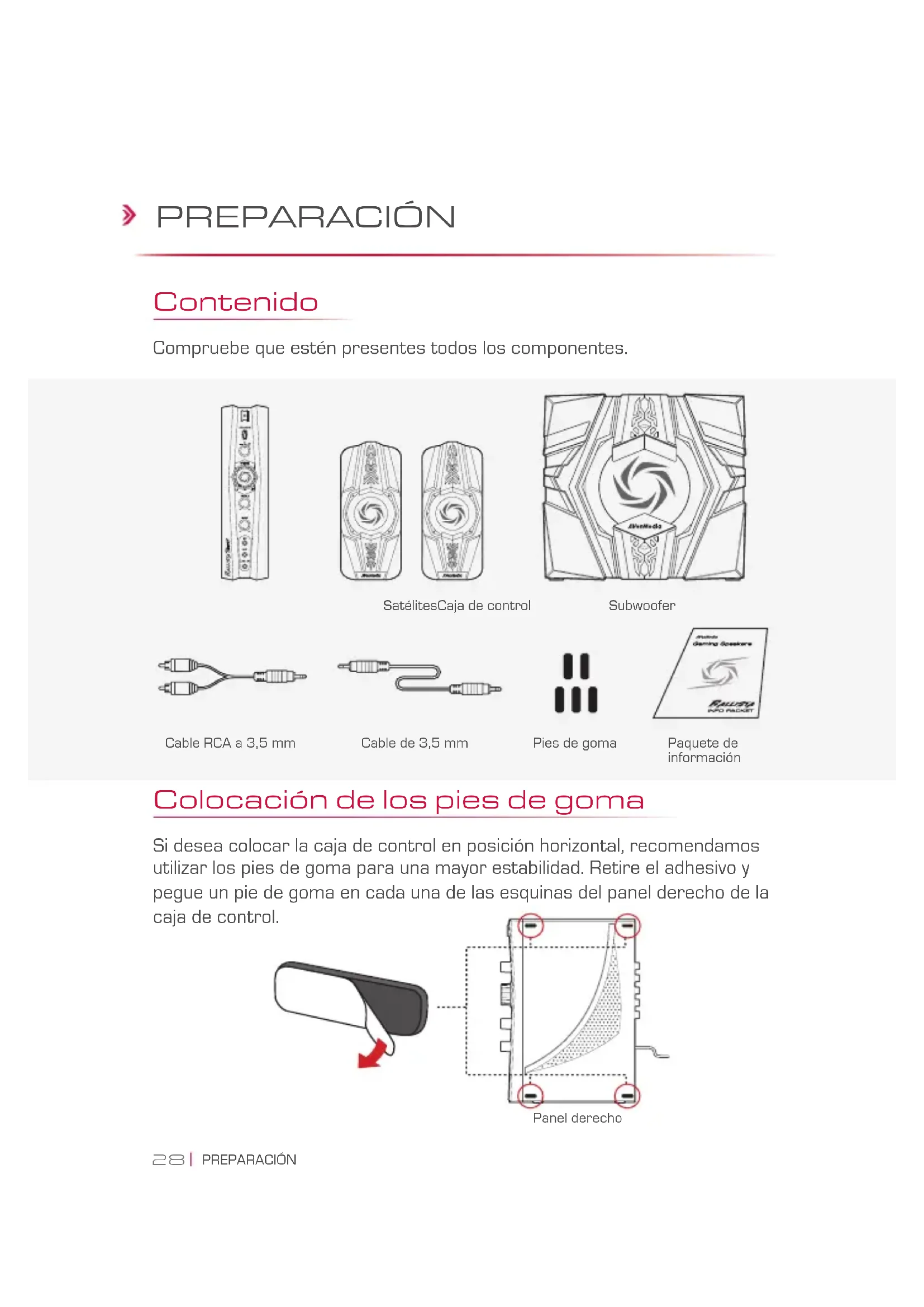 LINE OUT Ordenador de sobremesa/portátilMicrófono CONEXIÓN Para evitar daños en sus altavoces o equipo, baje siempre el volumen y apague todos los dispositivos antes de realizar cualquier conexión. PC y micrófono Panel delanteroSubwooferSatélitesPanel traseroConecte sus satélites, subwoofer y audio de PC a la caja de control.1. Conecte la caja de control a una toma de corriente.2. Pulse el Botón de encendido/apagado del Ballista Trinity.3.31 CONEXIÓN Consola y otras fuentes