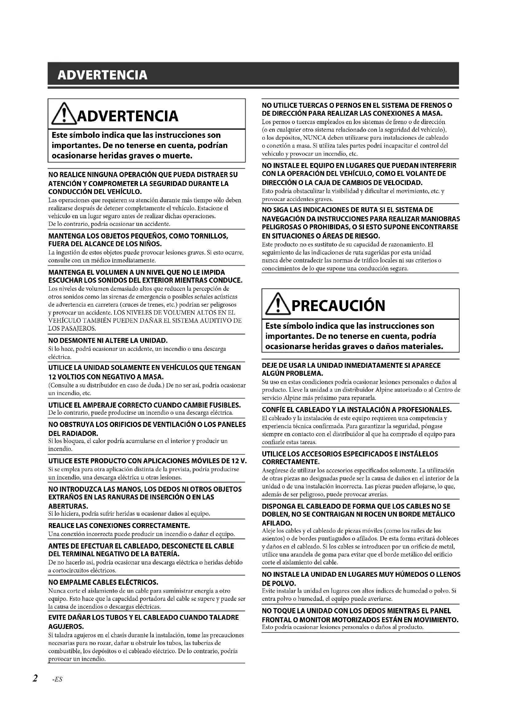- Especificaciones ALPINE X800D-U QRG 68-24567Z45-A (ES) 2-ES Prim Funcio Puede mBoto Ubicac ADVERTENCIA ADVERTENCIA Este símbolo indica que las instrucciones son importantes. De no tenerse en cuenta, podrían ocasionarse heridas graves o muerte.NO REALICE NINGUNA OPERACIÓN QUE PUEDA DISTRAER SU ATENCIÓN Y COMPROMETER LA SEGURIDAD DURANTE LA CONDUCCIÓN DEL VEHÍCULO.Las operaciones que requieren su atención durante más tiempo sólo deben realizarse después de detener completamente el vehículo. Estacione el vehículo en un lugar seguro antes de realizar dichas operaciones. De lo contrario, podría ocasionar un accidente.MANTENGA LOS OBJETOS PEQUEÑOS, COMO TORNILLOS, FUERA DEL ALCANCE DE LOS NIÑOS.La ingestión de estos objetos puede provocar lesiones graves. Si esto ocurre, consulte con un médico inmediatamente.MANTENGA EL VOLUMEN A UN NIVEL QUE NO LE IMPIDA ESCUCHAR LOS SONIDOS DEL EXTERIOR MIENTRAS CONDUCE.Los niveles de volumen demasiado altos que reducen la percepción de otros sonidos como las sirenas de emergencia o posibles señales acústicas de advertencia en carretera (cruces de trenes, etc.) podrían ser peligrosos y provocar un accidente. LOS NIVELES DE VOLUMEN ALTOS EN EL VEHÍCULO TAMBIÉN PUEDEN DAÑAR EL SISTEMA AUDITIVO DE LOS PASAJEROS.NO DESMONTE NI ALTERE LA UNIDAD.Si lo hace, podrá ocasionar un accidente, un incendio o una descarga eléctrica.UTILICE LA UNIDAD SOLAMENTE EN VEHÍCULOS QUE TENGAN 12 VOLTIOS CON NEGATIVO A MASA.(Consulte a su distribuidor en caso de duda.) De no ser así, podría ocasionar un incendio, etc.UTILICE EL AMPERAJE CORRECTO CUANDO CAMBIE FUSIBLES.De lo contrario, puede producirse un incendio o una descarga eléctrica.NO OBSTRUYA LOS ORIFICIOS DE VENTILACIÓN O LOS PANELES DEL RADIADOR.Si los bloquea, el calor podría acumularse en el interior y producir un incendio.UTILICE ESTE PRODUCTO CON APLICACIONES MÓVILES DE 12 V.Si se emplea para otra aplicación distinta de la prevista, podría producirse un incendio, una descarga eléctrica u otras lesiones.NO INTRODUZCA LAS MANOS, LOS DEDOS NI OTROS OBJETOS EXTRAÑOS EN LAS RANURAS DE INSERCIÓN O EN LAS ABERTURAS.Si lo hiciera, podría sufrir heridas u ocasionar daños al equipo.REALICE LAS CONEXIONES CORRECTAMENTE.Una conexión incorrecta puede producir un incendio o dañar el equipo.ANTES DE EFECTUAR EL CABLEADO, DESCONECTE EL CABLE DEL TERMINAL NEGATIVO DE LA BATERÍA.De no hacerlo así, podría ocasionar una descarga eléctrica o heridas debido a cortocircuitos eléctricos.NO EMPALME CABLES ELÉCTRICOS.Nunca corte el aislamiento de un cable para suministrar energía a otro equipo. Esto hace que la capacidad portadora del cable se supere y puede ser la causa de incendios o descargas eléctricas.EVITE DAÑAR LOS TUBOS Y EL CABLEADO CUANDO TALADRE AGUJEROS.Si taladra agujeros en el chasis durante la instalación, tome las precauciones necesarias para no rozar, dañar u obstruir los tubos, las tuberías de combustible, los depósitos o el cableado eléctrico. De lo contrario, podría provocar un incendio.NO UTILICE TUERCAS O PERNOS EN EL SISTEMA DE FRENOS O DE DIRECCIÓN PARA REALIZAR LAS CONEXIONES A MASA.Los pernos o tuercas empleados en los sistemas de freno o de dirección (o en cualquier otro sistema relacionado con la seguridad del vehículo), o los depósitos, NUNCA deben utilizarse para instalaciones de cableado o conexión a masa. Si utiliza tales partes podrá incapacitar el control del vehículo y provocar un incendio, etc.NO INSTALE EL EQUIPO EN LUGARES QUE PUEDAN INTERFERIR CON LA OPERACIÓN DEL VEHÍCULO, COMO EL VOLANTE DE DIRECCIÓN O LA CAJA DE CAMBIOS DE VELOCIDAD.Esto podría obstaculizar la visibilidad y dificultar el movimiento, etc. y provocar accidentes graves.NO SIGA LAS INDICACIONES DE RUTA SI EL SISTEMA DE NAVEGACIÓN DA INSTRUCCIONES PARA REALIZAR MANIOBRAS PELIGROSAS O PROHIBIDAS, O SI ESTO SUPONE ENCONTRARSE EN SITUACIONES O ÁREAS DE RIESGO. Este producto no es sustituto de su capacidad de razonamiento. El seguimiento de las indicaciones de ruta sugeridas por esta unidad nunca debe contradecir las normas de tráfico locales ni sus criterios o conocimientos de lo que supone una conducción segura. PRECAUCIÓN Este símbolo indica que las instrucciones son importantes. De no tenerse en cuenta, podría ocasionarse heridas graves o daños materiales.DEJE DE USAR LA UNIDAD INMEDIATAMENTE SI APARECE ALGÚN PROBLEMA.Su uso en estas condiciones podría ocasionar lesiones personales o daños al producto. Lleve la unidad a un distribuidor Alpine autorizado o al Centro de servicio Alpine más próximo para repararla.CONFÍE EL CABLEADO Y LA INSTALACIÓN A PROFESIONALES.El cableado y la instalación de este equipo requieren una competencia y experiencia técnica confirmada. Para garantizar la seguridad, póngase siempre en contacto con el distribuidor al que ha comprado el equipo para confiarle estas tareas.UTILICE LOS ACCESORIOS ESPECIFICADOS E INSTÁLELOS CORRECTAMENTE.Asegúrese de utilizar los accesorios especificados solamente. La utilización de otras piezas no designadas puede ser la causa de daños en el interior de la unidad o de una instalación incorrecta. Las piezas pueden aflojarse, lo que, además de ser peligroso, puede provocar averías.DISPONGA EL CABLEADO DE FORMA QUE LOS CABLES NO SE DOBLEN, NO SE CONTRAIGAN NI ROCEN UN BORDE METÁLICO AFILADO.Aleje los cables y el cableado de piezas móviles (como los raíles de los asientos) o de bordes puntiagudos o afilados. De esta forma evitará dobleces y daños en el cableado. Si los cables se introducen por un orificio de metal, utilice una arandela de goma para evitar que el borde metálico del orificio corte el aislamiento del cable.NO INSTALE LA UNIDAD EN LUGARES MUY HÚMEDOS O LLENOS DE POLVO.Evite instalar la unidad en lugares con altos índices de humedad o polvo. Si entra polvo o humedad, el equipo puede averiarse.NO TOQUE LA UNIDAD CON LOS DEDOS MIENTRAS EL PANEL FRONTAL O MONITOR MOTORIZADOS ESTÁN 