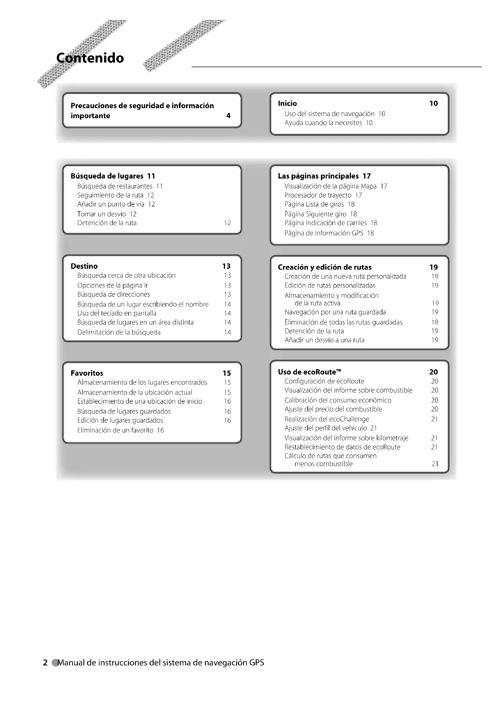 - Para montar y conectar el cableado de este producto se necesita contar con la experiencia y los conocimientos necesarios. Las tareas de montaje y cableado deben realizarlas profesionales. No evitar las siguientes situaciones de posible riesgo puede provocar accidentes o colisiones que tengan como consecuencia la muerte o lesiones graves. Al navegar, compara atentamente la información que aparece en el sistema de navegación con todas las fuentes de navegación disponibles, como la información de carteles, señales y mapas. Para mayor seguridad, resuelve cualquier discrepancia o duda antes de continuar con la navegación. Conduce siempre el vehículo de forma segura. No dejes que el sistema de navegación te distraiga mientras conduces. Presta siempre total atención a todas las condiciones de conducción. Reduce el tiempo que empleas en visualizar la pantalla del sistema de navegación mientras conduces. En la medida de lo posible, utiliza las indicaciones de voz. No introduzcas destinos, cambies configuraciones o accedas a ninguna función que requiera un uso prolongado de los controles del sistema de navegación mientras conduces. Detén el vehículo de forma segura y en un lugar permitido antes de efectuar dichas operaciones. Mantén el volumen del sistema a un nivel lo suficientemente bajo como para poder escuchar el ruido exterior mientras conduces. Si ya no puedes escuchar el ruido exterior, es posible que no puedas reaccionar de forma adecuada a la situación vial. Esto puede ser causa de accidentes. El sistema de navegación no mostrará la posición actual correcta del vehículo la primera vez que se utilice tras su compra, o bien si se ha desconectado la batería del vehículo. Sin embargo, las señales del satélite GPS se recibirán en breve y se mostrará la posición correcta. Ten cuidado con la temperatura ambiental. Utilizar el sistema de navegación con temperaturas extremas puede dar lugar a un funcionamiento incorrecto o provocar daños. Ten también en cuenta que la unidad puede dañarse con vibraciones intensas, objetos metálicos o filtraciones de agua. 2PRECAUCIONES No evitar las siguientes situaciones de riesgo potencial puede provocar lesiones o daños materiales. El sistema de navegación se ha diseñado con el fin de proporcionar sugerencias para tu ruta. No refleja cierres de carreteras, las condiciones de las mismas, condiciones del tiempo ni otros factores que puedan influir en la seguridad y el tiempo de conducción. Utiliza el sistema sólo como ayuda para la ruta. No intentes utilizar el sistema de navegación para cualquier otro propósito que requiera mediciones precisas de la dirección, la distancia, la ubicación o la topografía. El funcionamiento del sistema GPS (del inglés, Global Positioning System, Sistema de posicionamiento global) corre a cargo del gobierno de los Estados Unidos, que es el único responsable de su precisión y mantenimiento. El sistema del gobierno está sujeto a cambios que pueden afectar a la precisión y al rendimiento de todos los equipos GPS, incluido el sistema de navegación. Aunque dicho sistema es un dispositivo de navegación preciso, cualquier dispositivo de este tipo se puede utilizar de forma errónea o malinterpretar y, por tanto, dejar de ser seguro.