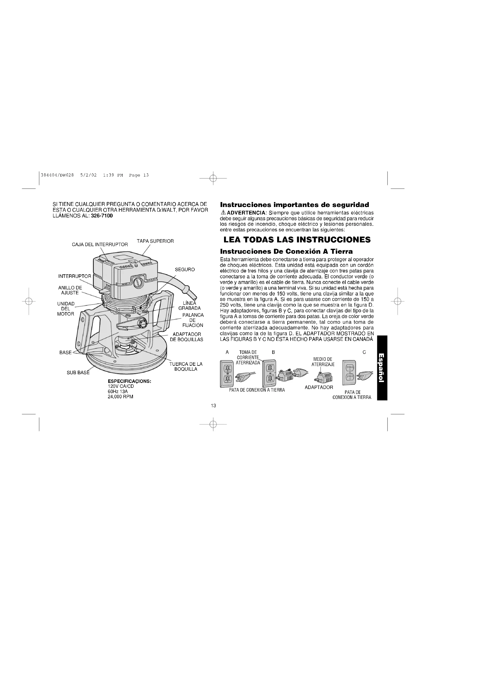 TEL. 326-7100 SECCI N AMARILLA Si funciona…y funciona muy bien. Para servicio y ventas consulte “HERRAMIENTAS ELECTRICAS” en la sección amarilla. 384404/DW628 5/2/02 1:39 PM Page 20