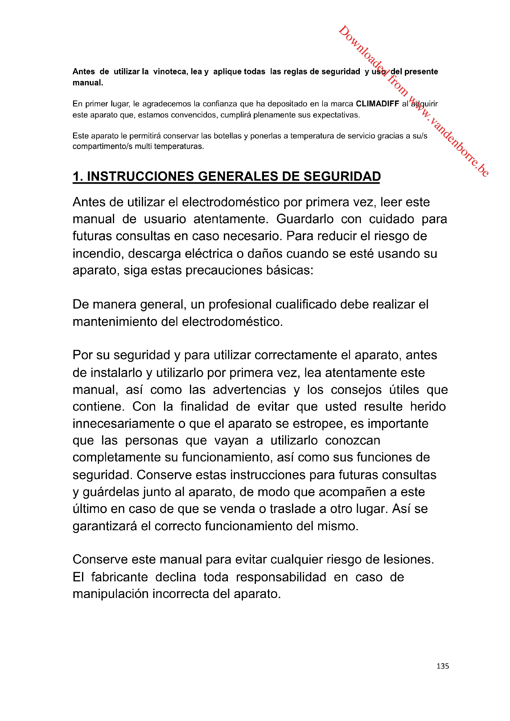 Dit apparaat is uitsluitend bedoeld om wijn te bewaren. Downloaded from www.vandenborre.be135 Antes de utilizar la vinoteca, lea y aplique todas las reglas de seguridad y uso del presente manual. En primer lugar, le agradecemos la confianza que ha depositado en la marca CLIMADIFF al adquirir este aparato que, estamos convencidos, cumplirá plenamente sus expectativas. Este aparato le permitirá conservar las botellas y ponerlas a temperatura de servicio gracias a su/s compartimento/s multi temperaturas.