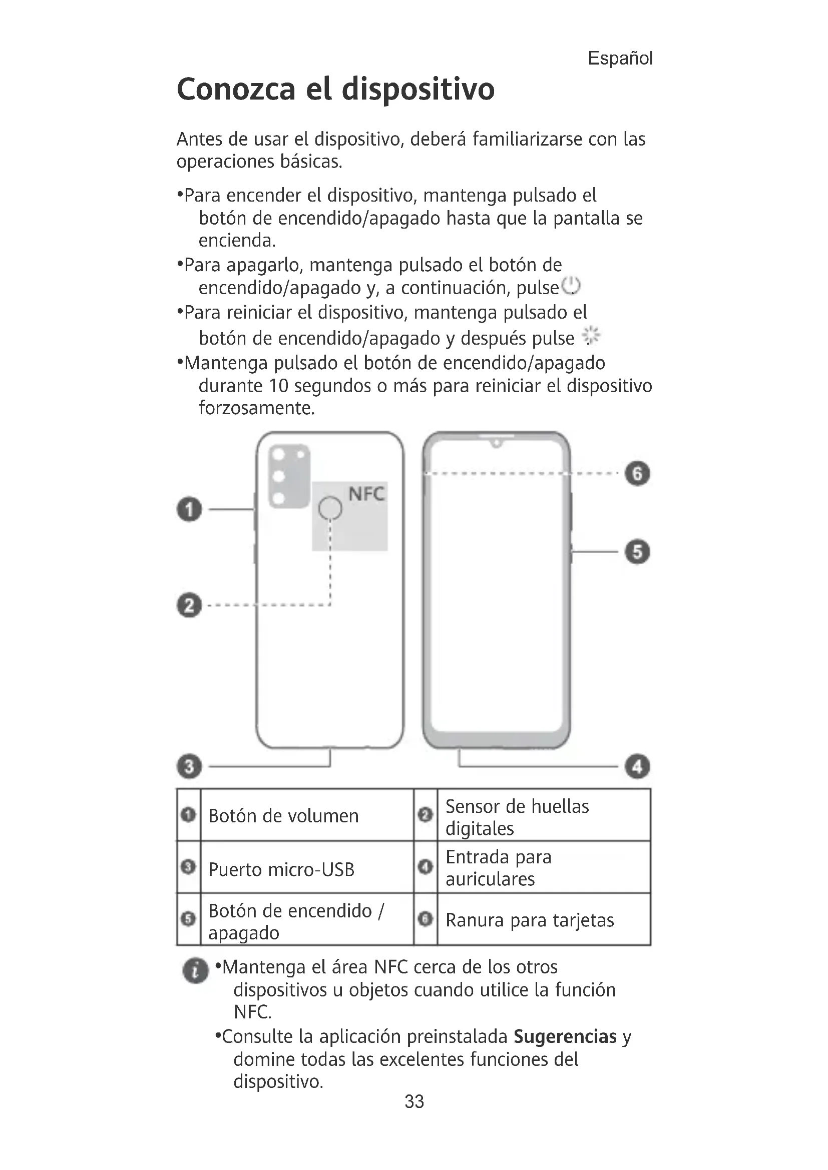 - Consulte la aplicación preinstalada Sugerencias y domine todas las excelentes funciones del dispositivo. Español 33Pasos iniciales