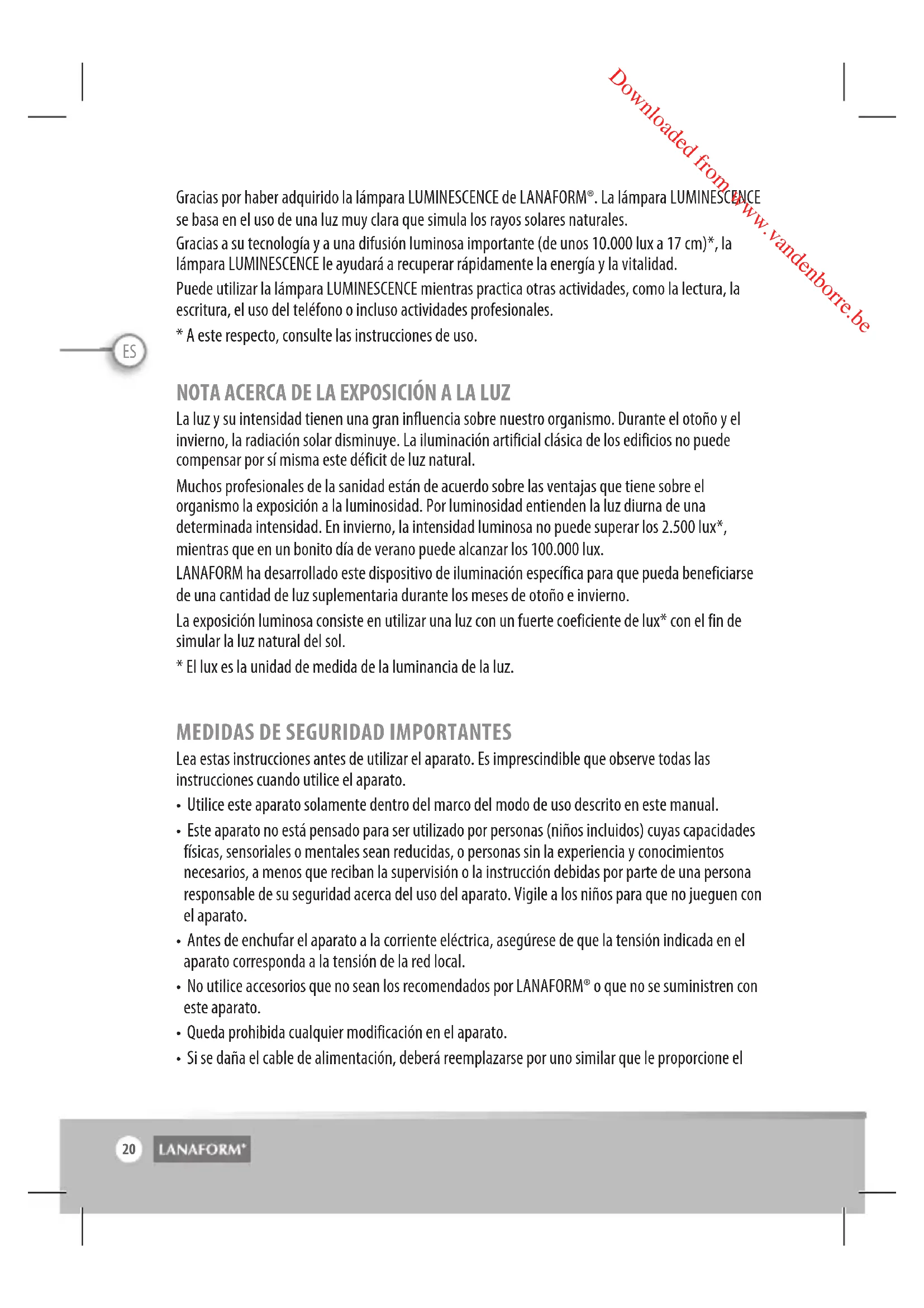 Downloaded from www.vandenborre.beES Gracias por haber adquirido la lámpara LUMINESCENCE de LANAFORM®. La lámpara LUMINESCENCE se basa en el uso de una luz muy clara que simula los rayos solares naturales. Gracias a su tecnología y a una difusión luminosa importante (de unos 10.000 lux a 17 cm)*, la lámpara LUMINESCENCE le ayudará a recuperar rápidamente la energía y la vitalidad. Puede utilizar la lámpara LUMINESCENCE mientras practica otras actividades, como la lectura, la escritura, el uso del teléfono o incluso actividades profesionales.