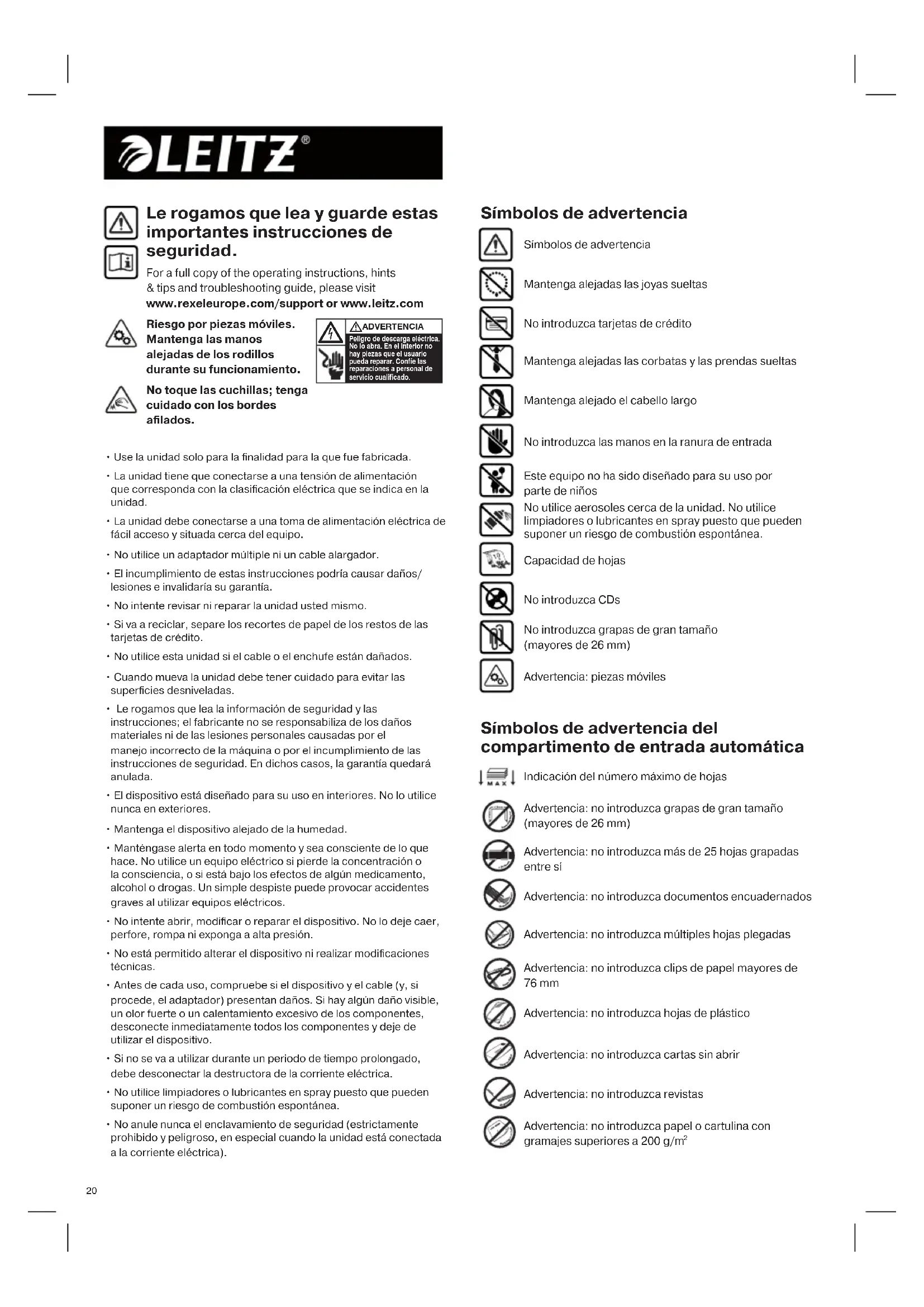 - No anule nunca el enclavamiento de seguridad (estrictamente prohibido y peligroso, en especial cuando la unidad está conectada a la corriente eléctrica). Le rogamos que lea y guarde estas importantes instrucciones de seguridad. For a full copy of the operating instructions, hints & tips and troubleshooting guide, please visit www.rexeleurope.com/support or www.leitz.com Mantenga alejadas las joyas sueltas Símbolos de advertencia Símbolos de advertencia No toque las cuchillas; tenga cuidado con los bordes afilados. Riesgo por piezas móviles. Mantenga las manos alejadas de los rodillos durante su funcionamiento. Advertencia: no introduzca grapas de gran tamaño (mayores de 26 mm) Advertencia: no introduzca documentos encuadernados Advertencia: no introduzca más de 25 hojas grapadas entre sí Símbolos de advertencia del compartimento de entrada automática Advertencia: no introduzca múltiples hojas plegadas Advertencia: no introduzca clips de papel mayores de 76 mm Indicación del número máximo de hojas Advertencia: no introduzca revistas Advertencia: no introduzca papel o cartulina con gramajes superiores a 200 g/m