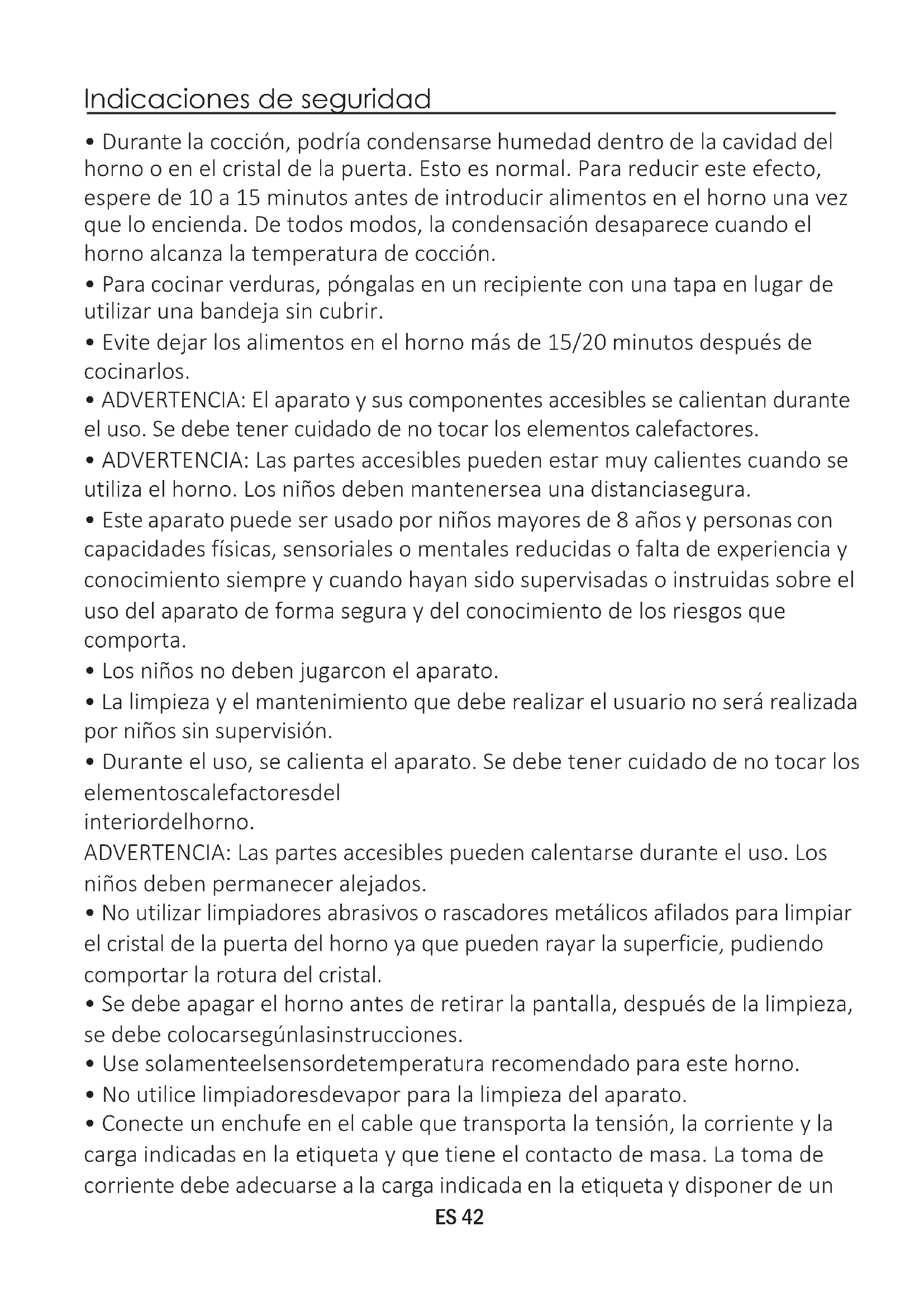 Utilice el horno solo con el fin para el que se ha diseñado, es decir: únicamente para cocer alimentos; cualquier otro uso, por ejemplo como fuente de calefacción, se considera impropio y por lo tanto peligroso. El fabricante no puede ser considerado responsable de eventuales daños derivados de usos impropios,erróneoso irracionales. El uso de cualquier aparato eléctrico comportala observación de una serie de reglasfundamentales: - no tirardel cable de alimentaciónparadesenchufarel conector de la toma de corriente; - no tocarel aparatoconlas manos ni los pies mojados o húmedos; - en caso de averíao mal funcionamiento del aparato,apáguelo y no lo manipule. - en generalno es aconsejable usar adaptadores,regletasni alargadores;