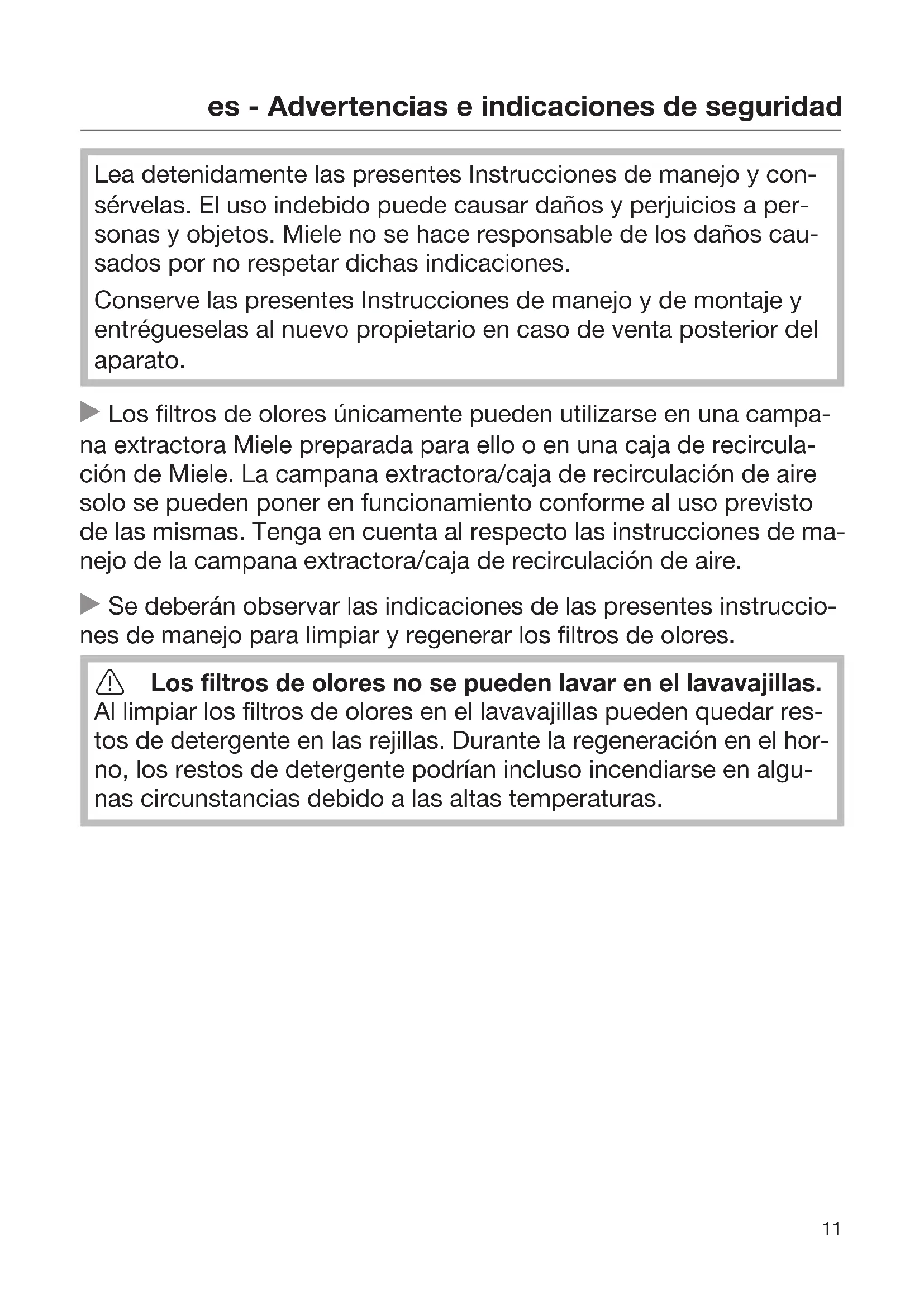 Lea detenidamente las presentes Instrucciones de manejo y con- sérvelas. El uso indebido puede causar daños y perjuicios a per- sonas y objetos. Miele no se hace responsable de los daños cau- sados por no respetar dichas indicaciones. Conserve las presentes Instrucciones de manejo y de montaje y entrégueselas al nuevo propietario en caso de venta posterior del aparato. Los filtros de olores únicamente pueden utilizarse en una campa- na extractora Miele preparada para ello o en una caja de recircula- ción de Miele. La campana extractora/caja de recirculación de aire solo se pueden poner en funcionamiento conforme al uso previsto de las mismas. Tenga en cuenta al respecto las instrucciones de ma- nejo de la campana extractora/caja de recirculación de aire. Se deberán observar las indicaciones de las presentes instruccio- nes de manejo para limpiar y regenerar los filtros de olores. Los filtros de olores no se pueden lavar en el lavavajillas. Al limpiar los filtros de olores en el lavavajillas pueden quedar res- tos de detergente en las rejillas. Durante la regeneración en el hor- no, los restos de detergente podrían incluso incendiarse en algu- nas circunstancias debido a las altas temperaturas.es - Instrucciones de manejo
