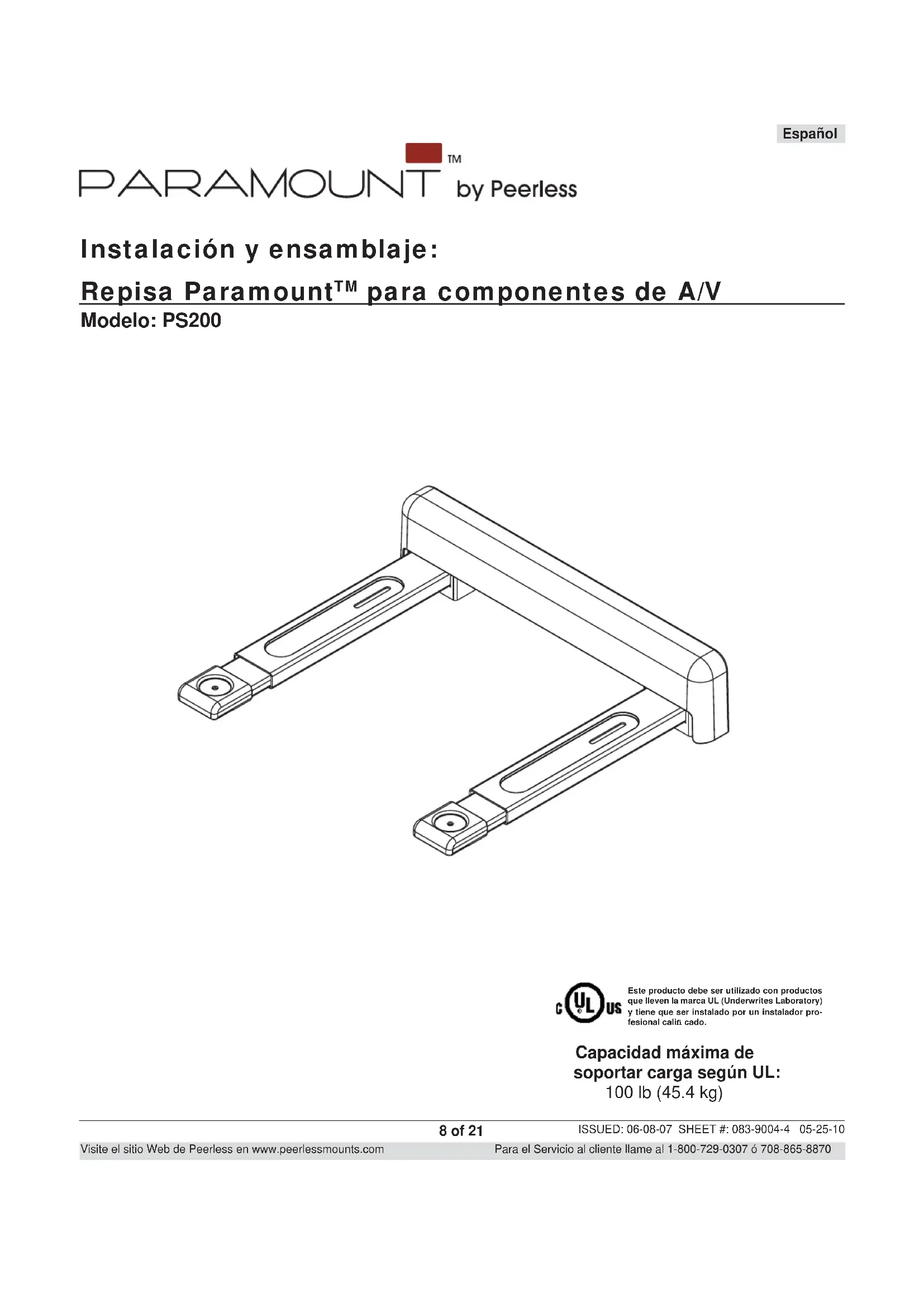 para componentes de A/V Modelo: PS200 Instalación y ensamblaje: Este producto debe ser utilizado con productos que lleven la marca UL (Underwrites Laboratory) y tiene que ser instalado por un instalador pro-fesional califi cado. Capacidad máxima de soportar carga según UL: 100 lb (45.4 kg)9 of 21 ISSUED: 06-08-07 SHEET #: 083-9004-4 05-25-10 Visite el sitio Web de Peerless en www.peerlessmounts.com Para el Servicio al cliente llame al 1-800-729-0307 ó 708-865-8870 Español Nota: Lea la hoja de instrucciones completa antes de comenzar la instalación y el ensamblaje. Herramientas necesarias para el ensamblaje