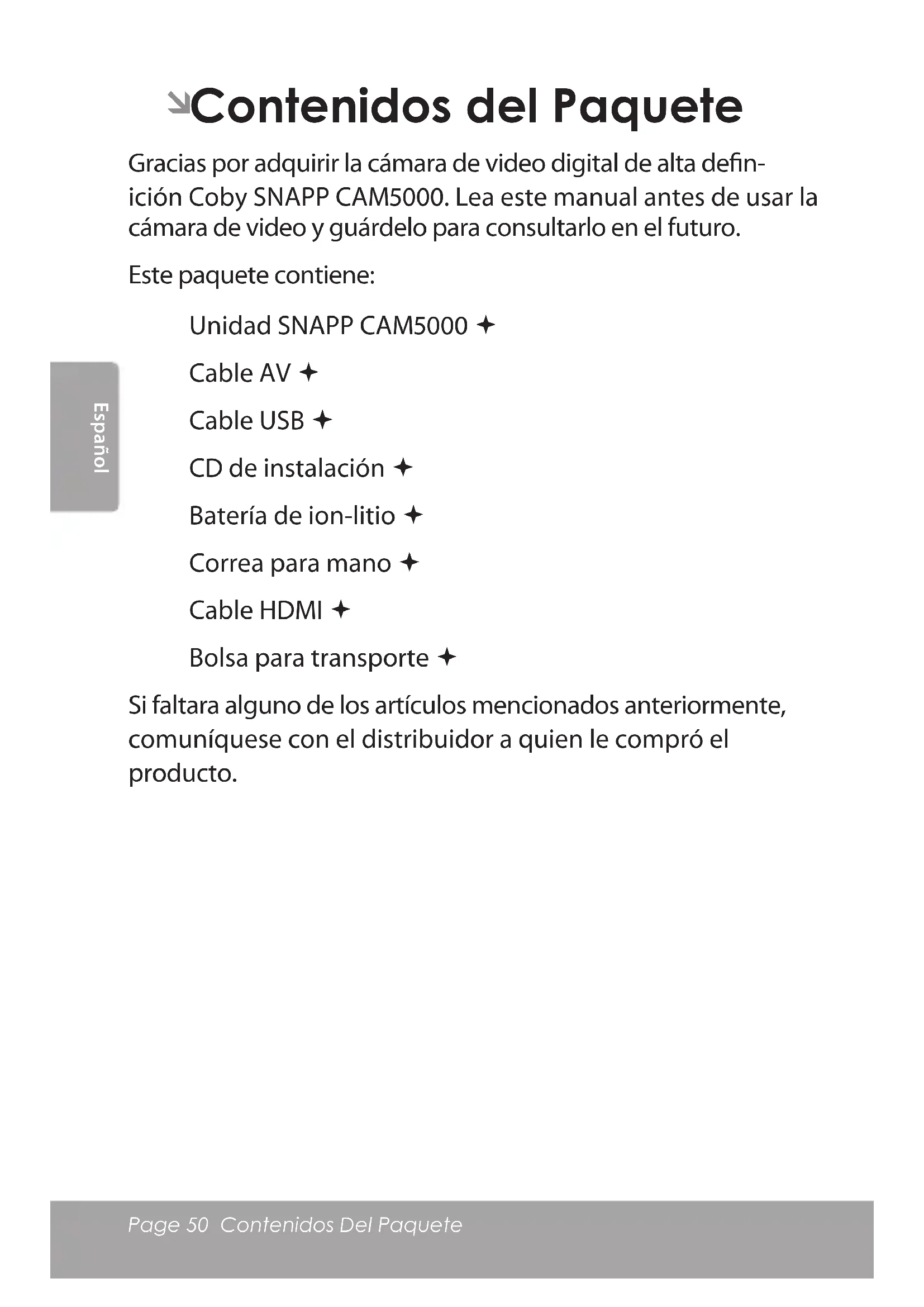 Gracias por adquirir la cámara de video digital de alta den- ición Coby SNAPP CAM5000. Lea este manual antes de usar la cámara de video y guárdelo para consultarlo en el futuro. Este paquete contiene: Unidad SNAPP CAM5000 Cable AV Cable USB CD de instalación Batería de ion-litio Correa para mano Cable HDMI Bolsa para transporte Si faltara alguno de los artículos mencionados anteriormente, comuníquese con el distribuidor a quien le compró el producto.Page 51 Características Español Características