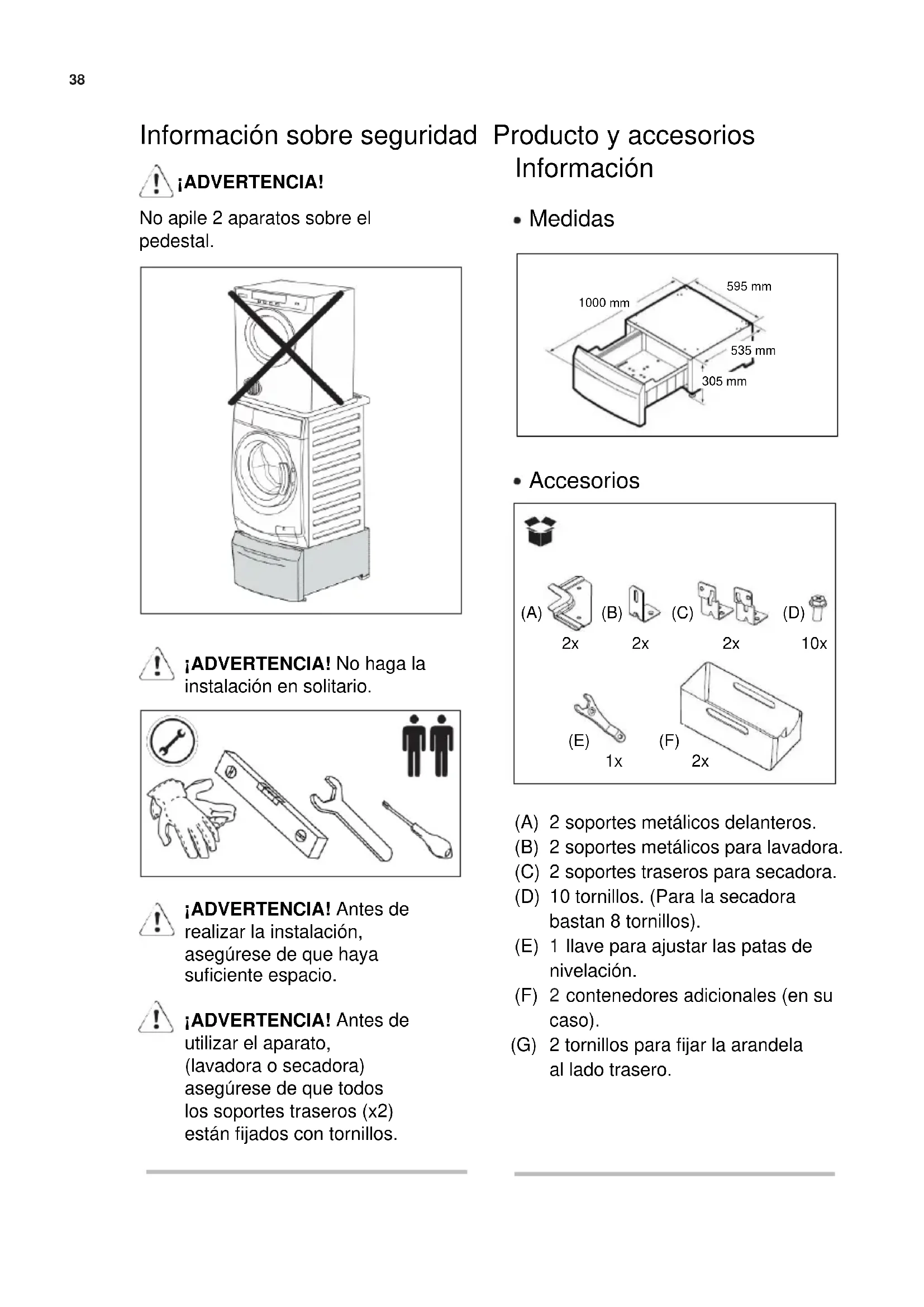 ¡ADVERTENCIA! Antes de realizar la instalación, asegúrese de que haya suficiente espacio. ¡ADVERTENCIA! Antes de utilizar el aparato, (lavadora o secadora) asegúrese de que todos los soportes traseros (x2) están fijados con tornillos. (A) (B) (C) (D) (E) (F) (G) 2 soportes metálicos delanteros. 2 soportes metálicos para lavadora. 2 soportes traseros para secadora. 10 tornillos. (Para la secadora bastan 8 tornillos). llave para ajustar las patas de nivelación. contenedores adicionales (en su caso). 2 tornillos para fijar la arandela al lado trasero.