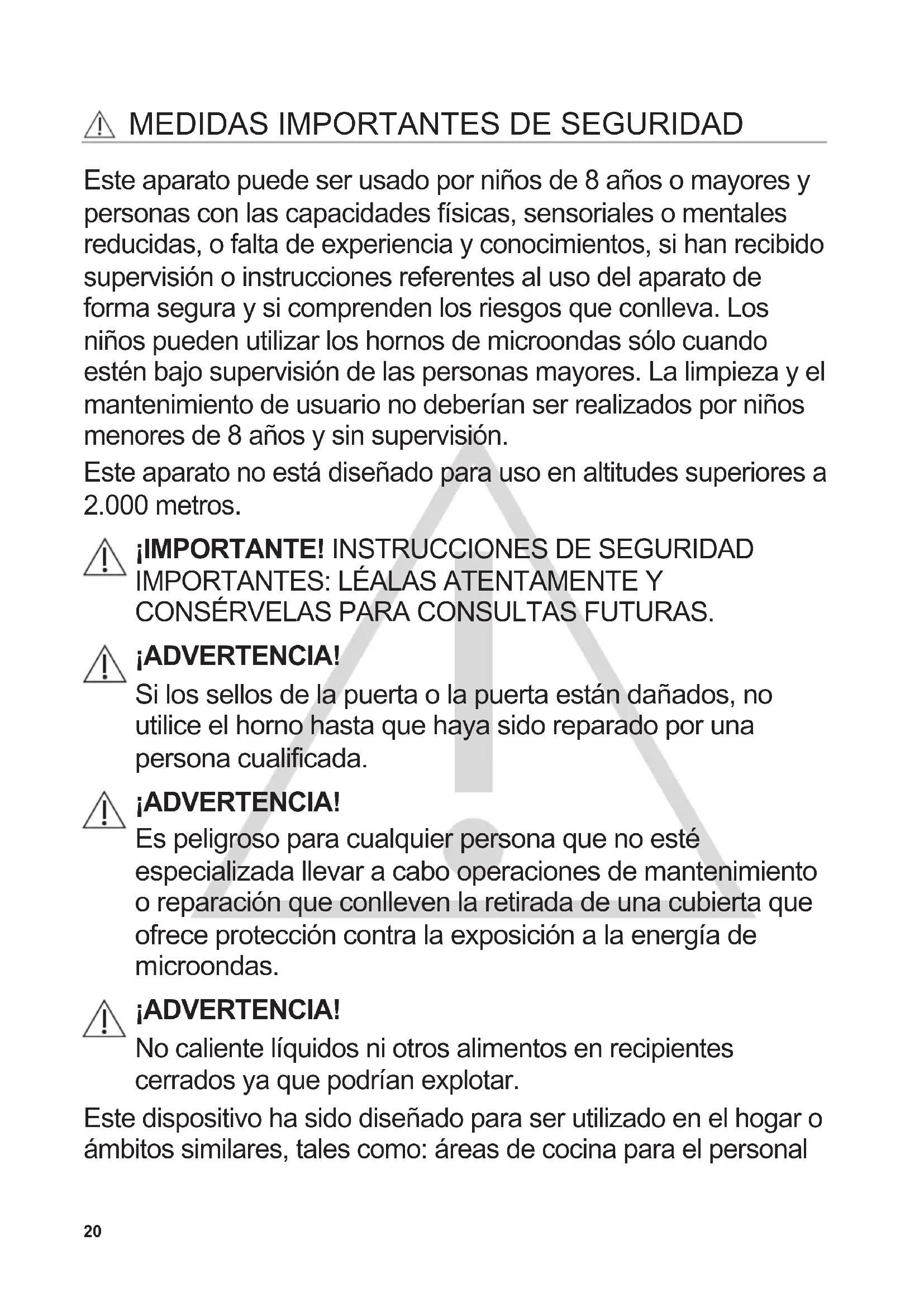 2_ZANUSSI_Spanish_17LSOLO_SBI_BASE_AE31UICTO_Layout 1 23/07/2020 11:08 Page 1920 Medidas iMportantes de seguridad este aparato puede ser usado por niños de 8 años o mayores y personas con las capacidades físicas, sensoriales o mentales reducidas, o falta de experiencia y conocimientos, si han recibido supervisión o instrucciones referentes al uso del aparato de forma segura y si comprenden los riesgos que conlleva. los niños pueden utilizar los hornos de microondas sólo cuando estén bajo supervisión de las personas mayores. la limpieza y el mantenimiento de usuario no deberían ser realizados por niños menores de 8 años y sin supervisión. este aparato no está diseñado para uso en altitudes superiores a