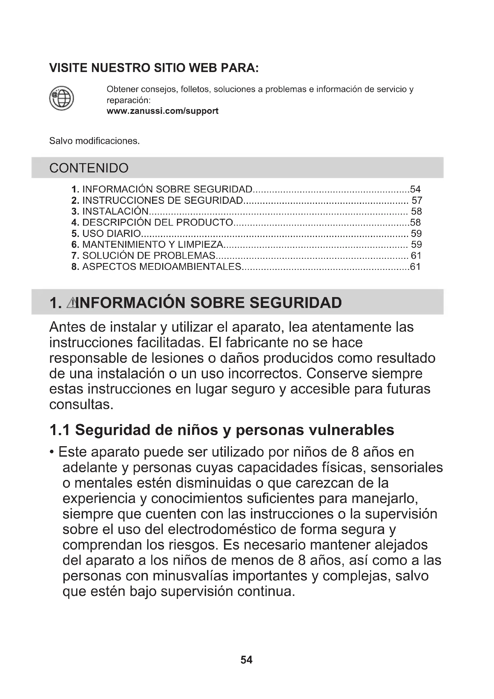 - Este aparato puede ser utilizado por niños de 8 años en adelante y personas cuyas capacidades físicas, sensoriales o mentales estén disminuidas o que carezcan de la experiencia y conocimientos suficientes para manejarlo, siempre que cuenten con las instrucciones o la supervisión sobre el uso del electrodoméstico de forma segura y comprendan los riesgos. Es necesario mantener alejados del aparato a los niños de menos de 8 años, así como a las personas con minusvalías importantes y complejas, salvo que estén bajo supervisión continua. 54• Es necesario vigilar a los niños para que no jueguen con el aparato.