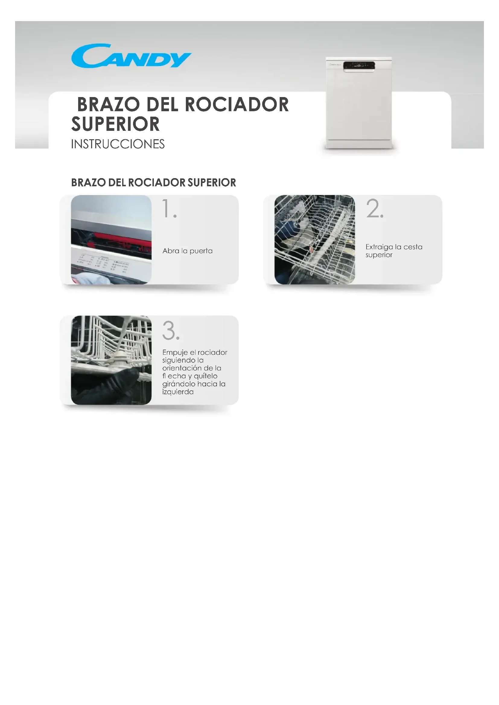 SUPERIOR INSTRUCCIONES BRAZO DEL ROCIADOR SUPERIORAbra la puerta Extraiga la cesta inferior
