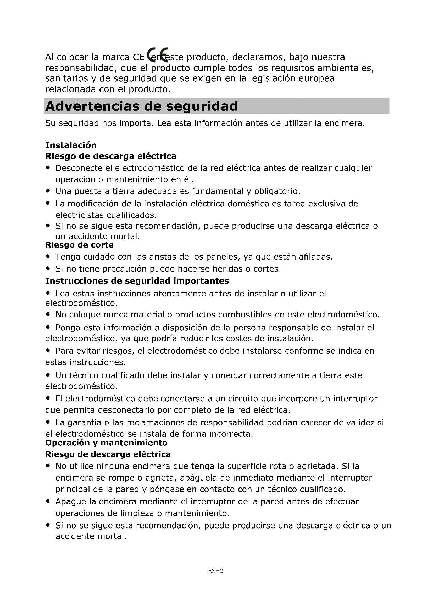 Advertencias de seguridad Al colocar la marca CE en este producto, declaramos, bajo nuestra responsabilidad, que el producto cumple todos los requisitos ambientales, sanitarios y de seguridad que se exigen en la legislación europea relacionada con el producto. Su seguridad nos importa. Lea esta información antes de utilizar la encimera. Instalación Riesgo de descarga eléctrica