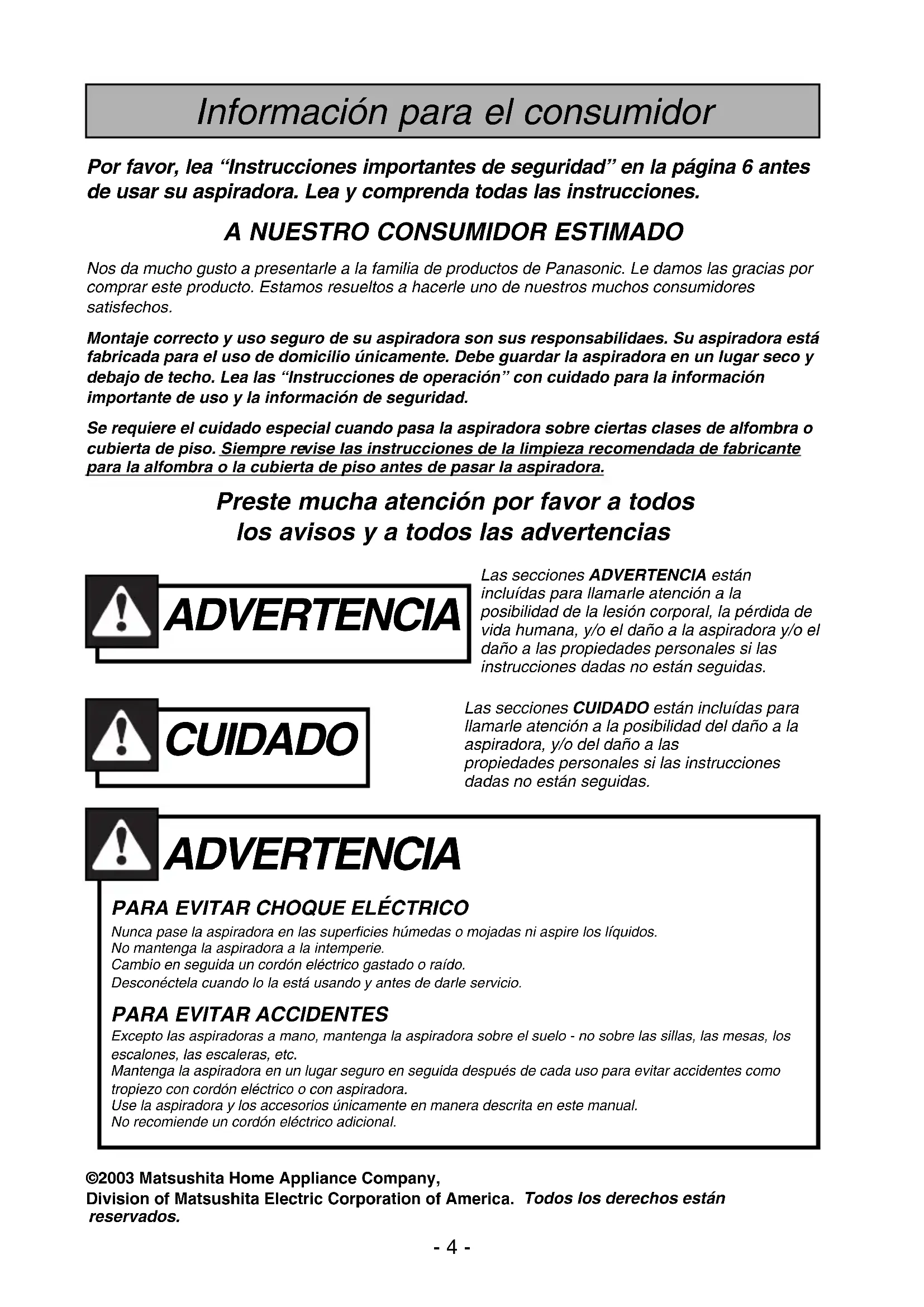 Nos da mucho gusto a presentarle a la familia de productos de Panasonic. Le damos las gracias por comprar este producto. Estamos resueltos a hacerle uno de nuestros muchos consumidores satisfechos. Montaje correcto y uso seguro de su aspiradora son sus responsabilidaes. Su aspiradora está fabricada para el uso de domicilio únicamente. Debe guardar la aspiradora en un lugar seco y debajo de techo. Lea las “Instrucciones de operación” con cuidado para la información importante de uso y la información de seguridad. Se requiere el cuidado especial cuando pasa la aspiradora sobre ciertas clases de alfombra o cubierta de piso. Siempre re vise las instrucciones de la limpieza recomendada de fabricante para la alfombra o la cubierta de piso antes de pasar la aspiradora. Preste mucha atención por favor a todos los avisos y a todos las advertencias ADVERTENCIA Las secciones ADVERTENCIA están incluídas para llamarle atención a la posibilidad de la lesión corporal, la pérdida de vida humana, y/o el daño a la aspiradora y/o el daño a las propiedades personales si las instrucciones dadas no están seguidas. Las secciones CUIDADO están incluídas para llamarle atención a la posibilidad del daño a laaspiradora, y/o del daño a laspropiedades personales si las instruccionesdadas no están seguidas. CUIDADO ©2003 Matsushita Home Appliance Company, Division of Matsushita Electric Corporation of America.Todos los derechos estánreservados.- 50 - Notes, Remarques, Notas Porter une attention particulière à tous les avertissements et à toutes les mises en garde. AVERTISSEMENT POUR PRÉVENIR LE RISQUE DE CHOCS ÉLECTRIQUES Ne jamais utiliser l’aspirateur sur une surface humide ou pour aspirer des liquides. Ne jamais ranger l’appareil à l’extérieur. Remplacer immédiatement tout cordon d’alimentation usé ou éraillé. Débrancher l’appareil de la prise secteur après usage et avant tout entretien. POUR PRÉVENIR LE RISQUE D’ACCIDENTS À l'exception des aspirateurs à main, garder l'appareil au sol. NE PAS l'utiliser sur des chaises ou des tables ni le passer sur des marches ou dans un escalier, par exemple. Ranger l'appareil après usage afin de prévenir les risques de trébucher sur le cordon ou l'appareil. Utiliser l'appareil et les accessoires de la manière recommandée. Il n'est pas recommandé d'utiliser un cordon prolongateur. Renseignements importants Il est recommandé de lire la section IMPORTANTES MESURES DE SÉCURITÉ à la page 6 avant d’utiliser l’appareil. S’assurer de lire et de bien comprendre toutes les instructions du présent manuel.