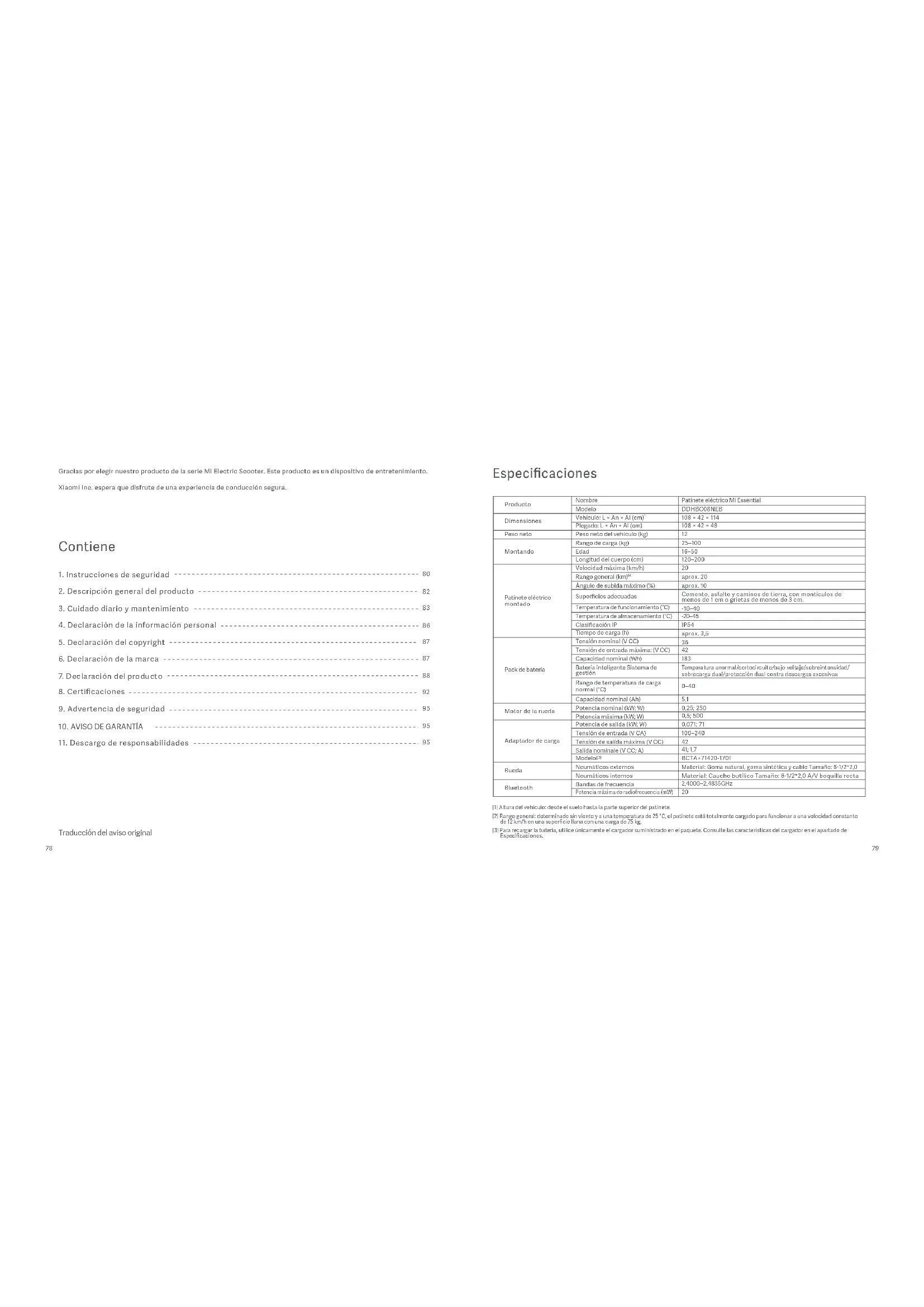 Traducción del aviso original Gracias por elegir nuestro producto de la serie Mi Electric Scooter. Este producto es un dispositivo de entretenimiento. Xiaomi Inc. espera que disfrute de una experiencia de conducción segura. [1] Altura del vehículo: desde el suelo hasta la parte superior del patinete. [2] Rango general: determinado sin viento y a una temperatura de 25 °C, el patinete está totalmente cargado para funcionar a una velocidad constante de 12 km/h en una superficie llana con una carga de 75 kg. [3] Para recargar la batería, utilice únicamente el cargador suministrado en el paquete. Consulte las características del cargador en el apartado de Especificaciones. Especificaciones Patinete eléctrico Mi Essential DDHBC08NEB 108 × 42 × 114 108 × 42 × 49