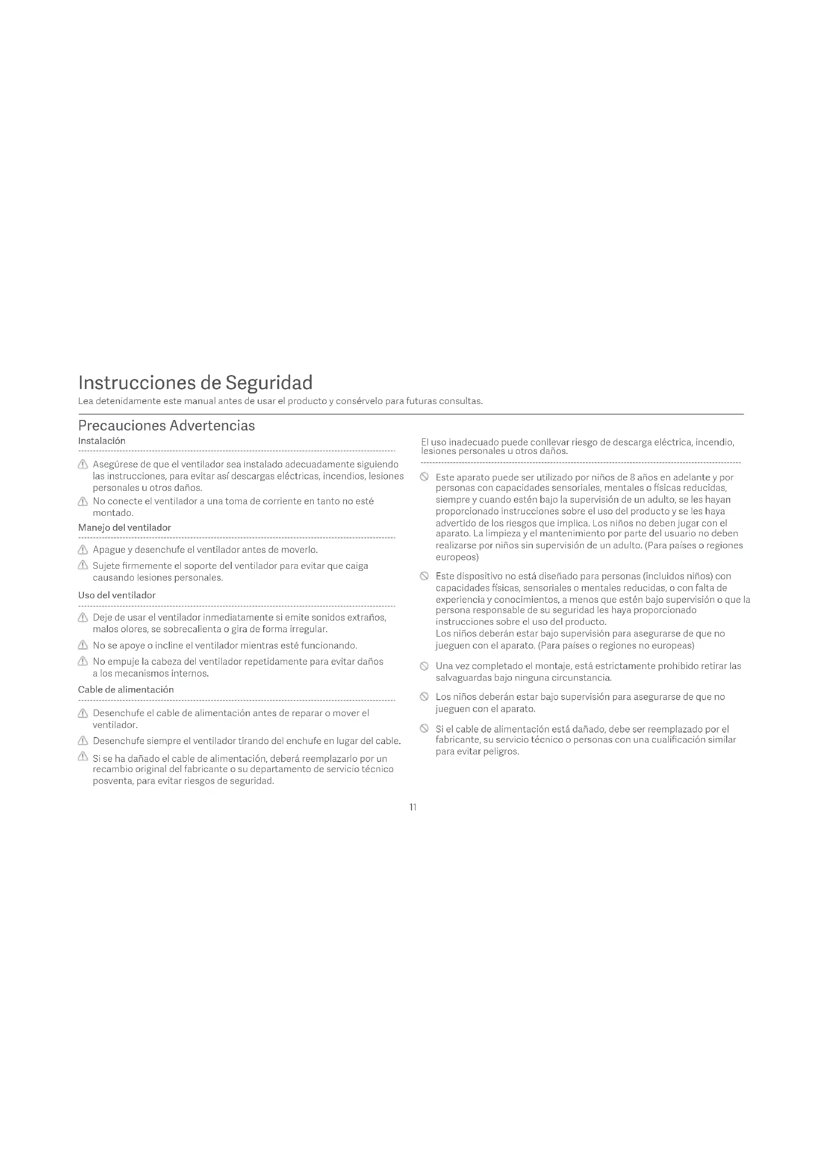 de la parrilla frontal se alinee con la marca de alineación derecha de la parrilla trasera. Asegúrese de que las parrillas están firmemente sujetas. Paso 6: Apriete la parrilla frontal Instrucciones de instalación Paso 5: Instalación de la parrilla frontal Inserte el cable de alimentación a una toma de corriente. Una vez escuche un pitido, el ventilador se habrá conectado con éxito. Conectar a la toma de alimentación Modo de uso Planta previa sujeción de las parrillas frontal y traseraMarca de alineación de la parrilla frontalMarca de alineación de la parrilla frontalMarca de alineación derecha de la parrilla traseraMarca de alineación izquierda de la parrilla traseraPlanta tras la unión de las parrillas frontal y trasera Presione el botón para encender el ventilador. Cuando lo encienda por primera vez, la velocidad por defecto es lenta (1). Cuando el ventilador esté funcionando, mantenga presionado el botón ● para detenerlo. Encender/apagar Encender Apagar Presione el botón para ajustar la velocidad. Con cada pulsación, el correspondiente indicador de estado se encenderá (vea la siguiente tabla). El ventilador registrará y utilizará la última velocidad utilizada cuando vuelva a encenderse. Nota: significa que el indicador está encendido; mientras que significa que el indicador está apagado. Cambiar de velocidad/modo Cambiar la velocidad Estado del indicador Velocidad del ventilador Lenta (1) Media (2)