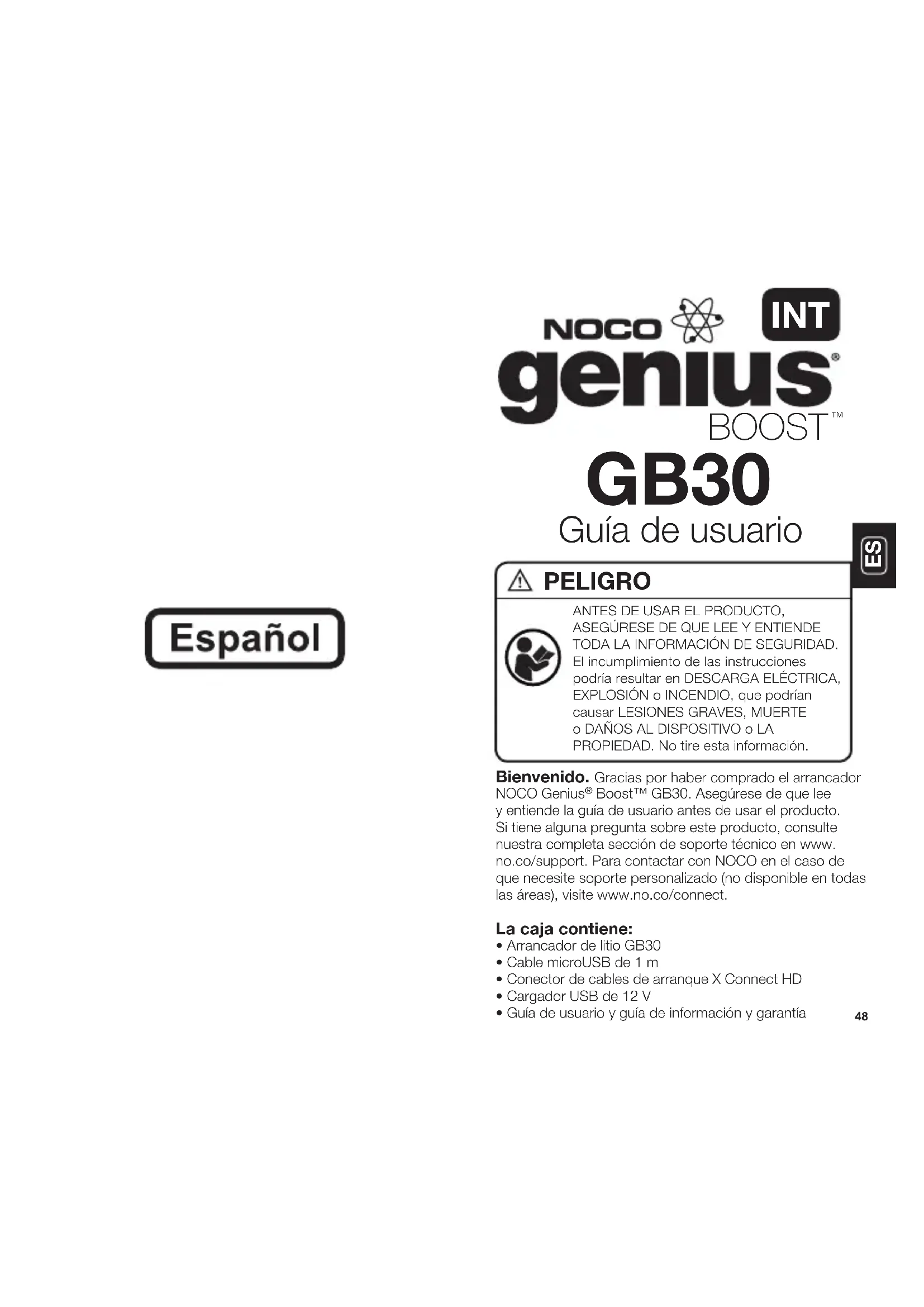 Bienvenido. Gracias por haber comprado el arrancador NOCO Genius Boost™ GB30. Asegúrese de que lee y entiende la guía de usuario antes de usar el producto. Si tiene alguna pregunta sobre este producto, consulte nuestra completa sección de soporte técnico en www.no.co/support. Para contactar con NOCO en el caso de que necesite soporte personalizado (no disponible en todas las áreas), visite www.no.co/connect.La caja contiene:• Arrancador de litio GB30• Cable microUSB de 1 m• Conector de cables de arranque X Connect HD• Cargador USB de 12 V• Guía de usuario y guía de información y garantía Guía de usuario GB30 ANTES DE USAR EL PRODUCTO, ASEGÚRESE DE QUE LEE Y ENTIENDE TODA LA INFORMACIÓN DE SEGURIDAD. El incumplimiento de las instrucciones podría resultar en DESCARGA ELÉCTRICA, EXPLOSIÓN o INCENDIO, que podrían causar LESIONES GRAVES, MUERTE o DAÑOS AL DISPOSITIVO o LA PROPIEDAD. No tire esta información. PELIGRO BOOST