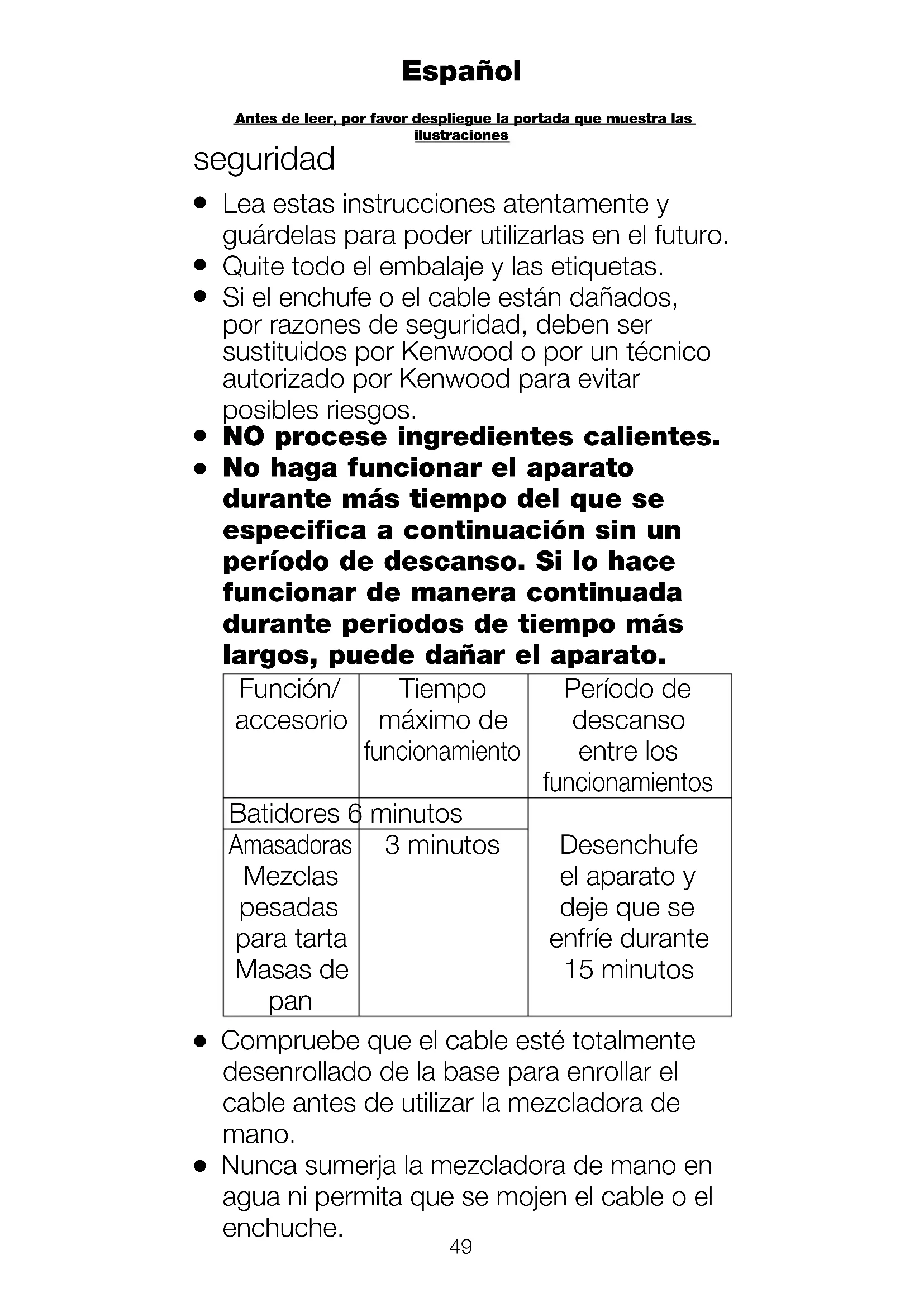 Nunca sumerja la mezcladora de mano en agua ni permita que se mojen el cable o el enchuche. Antes de leer, por favor despliegue la portada que muestra las ilustraciones Español50
