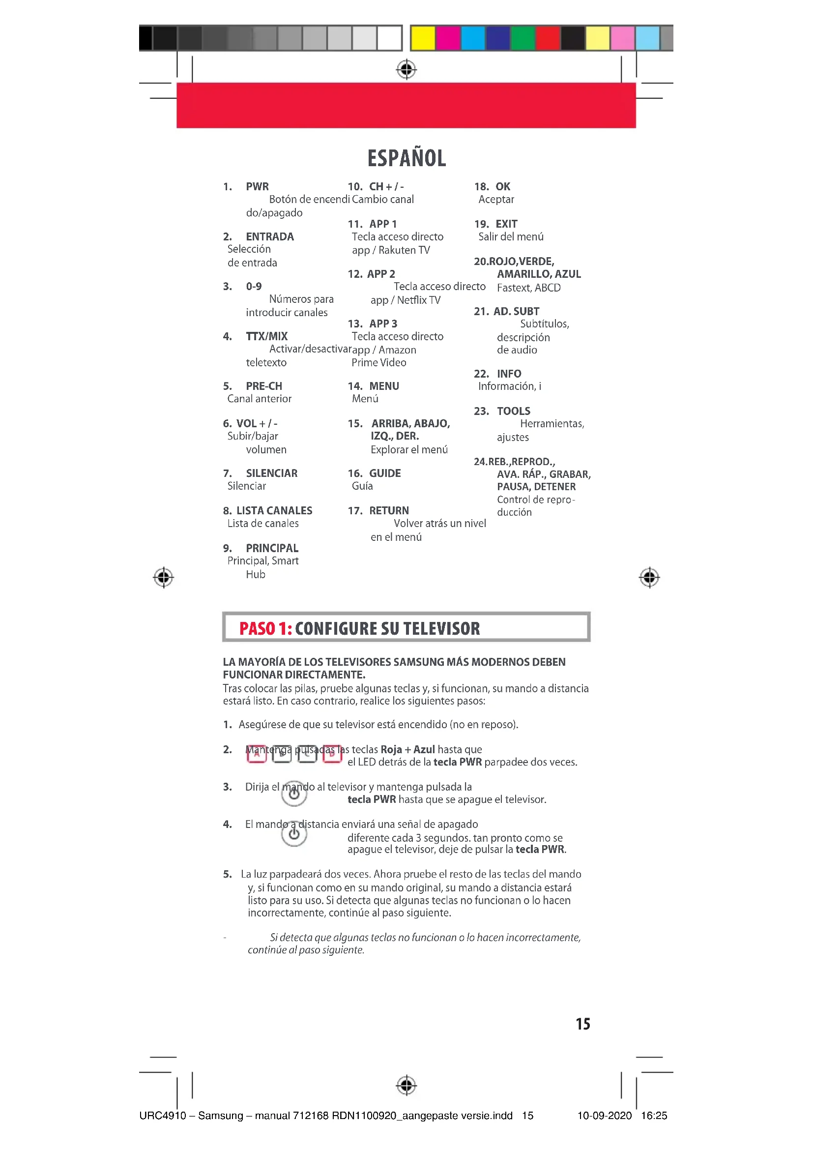 FRANÇAIS URC4910 – Samsung – manual 712168 RDN1100920_aangepaste versie.indd 14URC4910 – Samsung – manual 712168 RDN1100920_aangepaste versie.indd 14 10-09-2020 16:2510-09-2020 16:2515 ESPAÑOL LA MAYORÍA DE LOS TELEVISORES SAMSUNG MÁS MODERNOS DEBEN FUNCIONAR DIRECTAMENTE. Tras colocar las pilas, pruebe algunas teclas y, si funcionan, su mando a distancia estará listo. En caso contrario, realice los siguientes pasos: