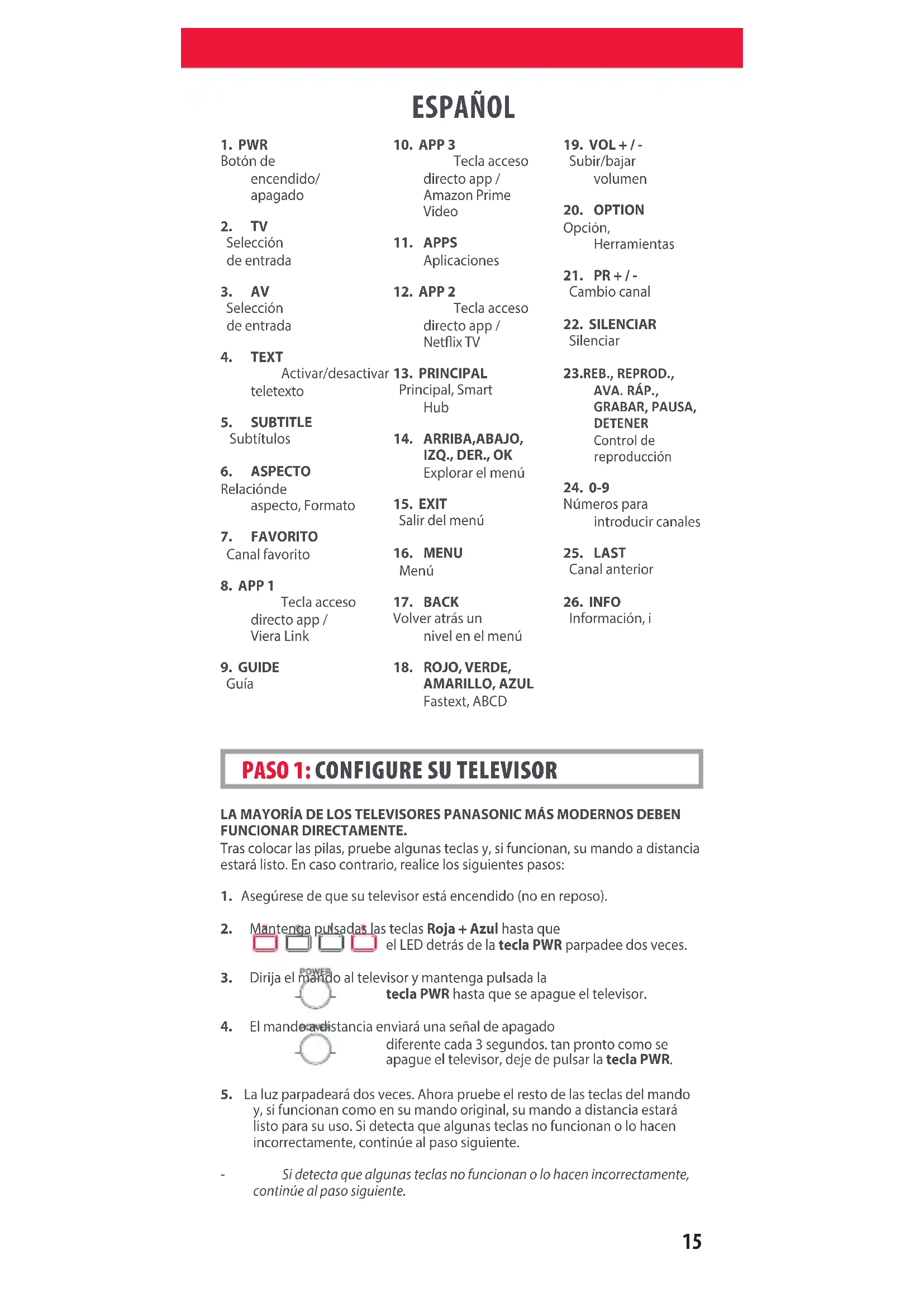 Información, i 712188_Panasonic_manual URC4914_RDN1091120.indd 15712188_Panasonic_manual URC4914_RDN1091120.indd 15 09-11-2020 13:1509-11-2020 13:1516 ESPAÑOL PROGRAME UNA NUEVA FUNCIÓN EN SU MANDO Su mando a distancia One For All puede aprender cualquier función de su mando a distancia original, siempre que funcione.1. Coloque el mando a distancia original delante del mando One For All sobre una supercie plana.2. Para aprender: Mantenga pulsadas las teclas VERDE + AMARILLA hasta que el LED parpadee dos veces.3. Pulse 975. El LED parpadeará dos veces.4. Pulse la tecla que desee programar en el mando a distancia One For All, por ejemplo: la tecla VOL +. El LED parpadeará rápidamente.5. Pulse la tecla que desee programar en el mando a distancia original, por ejemplo, la tecla VOL + de su dispositivo de AUDIO.6. Dos parpadeos: aceptar. Repita a partir del paso 4 si desea programar más teclas. Parpadeo largo: inténtelo de nuevo desde el paso 4.7. Cuando haya programado todas las teclas que necesite, mantenga pulsada la tecla ACEPTAR durante 3 segundos. El LED parpadeará dos veces.CÓMO ELIMINAR UNA FUNCIÓN PROGRAMADA 1. Mantenga pulsadas las teclas VERDE + AMARILLA hasta que el LED parpadee dos veces.2. Pulse 976.3. Pulse dos veces la tecla que hay que desprogramar.4. El LED parpadeará dos veces y la tecla volverá a su función original. PROGRAMACIÓN ¿HAY ALGUNAS TECLAS QUE NO FUNCIONAN COMO SE ESPERA?Si detecta que algunas teclas no funcionan o lo hacen incorrectamente, continúe al paso siguiente.1. Asegúrese de que su televisor está encendido (no en reposo).2. Mantenga pulsadas las teclas ROJA + AZUL hasta que el LED detrás de la tecla PWR parpadee dos veces.3. Dirija el mando al televisor y mantenga pulsada una de las teclas que no está funcionando correctamente (por ejemplo, Menu [Menú]). 4. El mando a distancia enviará una señal cada 3 segundos.5. Cuando se muestre la función correcta en la pantalla (en este caso Menu [Menú]), suelte la tecla.6. El LED parpadeará dos veces: su mando está listo para su uso. PASO 2: SI EL PASO 1 NO FUNCIONA COMO SE ESPERA