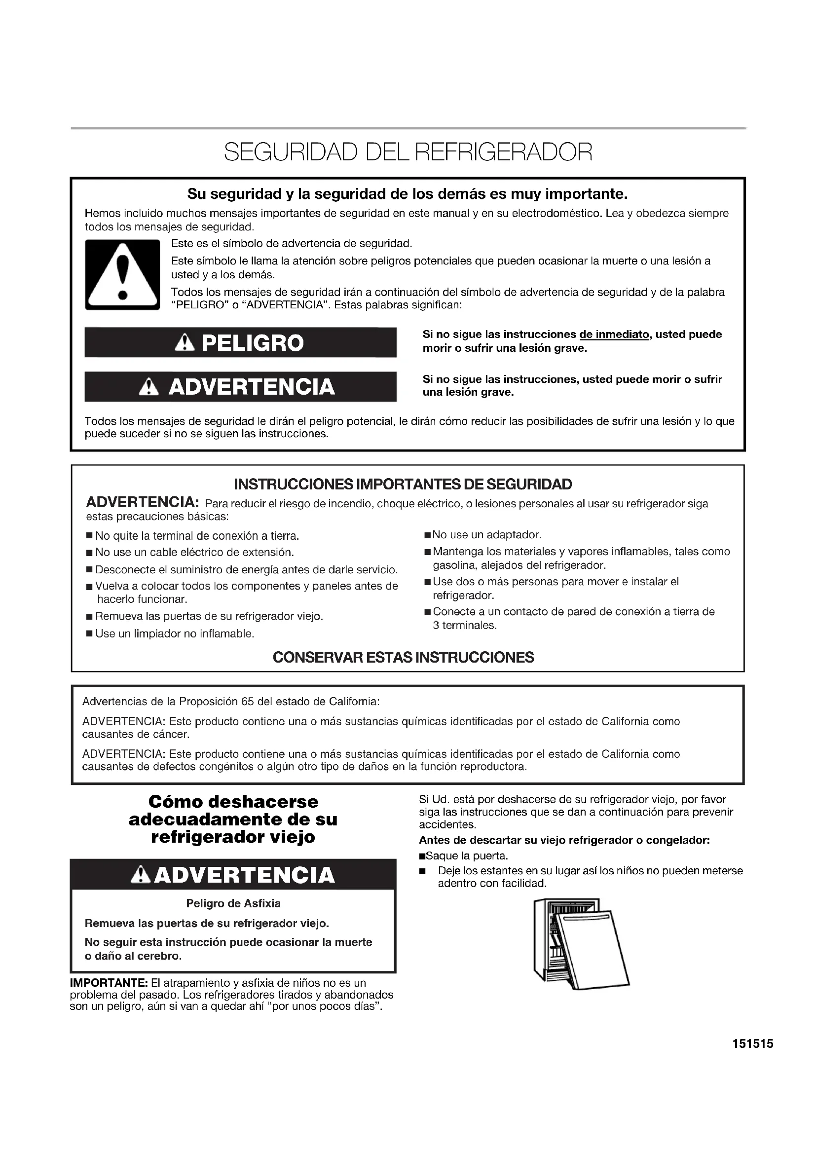 Cómo deshacerse adecuadamente de su refrigerador viejo IMPORTANTE: El atrapamiento y asfixia de niños no es un problema del pasado. Los refrigeradores tirados y abandonados son un peligro, aún si van a quedar ahí “por unos pocos días”. Si Ud. está por deshacerse de su refrigerador viejo, por favor siga las instrucciones que se dan a continuación para prevenir accidentes.Antes de descartar su viejo refrigerador o congelador:■ Saque la puerta. ■ Deje los estantes en su lugar así los niños no pueden meterse adentro con facilidad. Si no sigue las instrucciones de inmediato, usted puede morir o sufrir una lesión grave. Si no sigue las instrucciones, usted puede morir o sufrir una lesión grave. Todos los mensajes de seguridad le dirán el peligro potencial, le dirán cómo reducir las posibilidades de sufrir una lesión y lo que puede suceder si no se siguen las instrucciones. Su seguridad y la seguridad de los demás es muy importante. Hemos incluido muchos mensajes importantes de seguridad en este manual y en su electrodoméstico. Lea y obedezca siempre todos los mensajes de seguridad. ADVERTENCIA PELIGRO Este es el símbolo de advertencia de seguridad.Este símbolo le llama la atención sobre peligros potenciales que pueden ocasionar la muerte o una lesión a usted y a los demás.Todos los mensajes de seguridad irán a continuación del símbolo de advertencia de seguridad y de la palabra “PELIGRO” o “ADVERTENCIA”. Estas palabras significan: Para reducir el riesgo de incendio, choque eléctrico, o lesiones personales al usar su refrigerador siga estas precauciones básicas:ADVERTENCIA: INSTRUCCIONES IMPORTANTES DE SEGURIDADCONSERVAR ESTAS INSTRUCCIONES