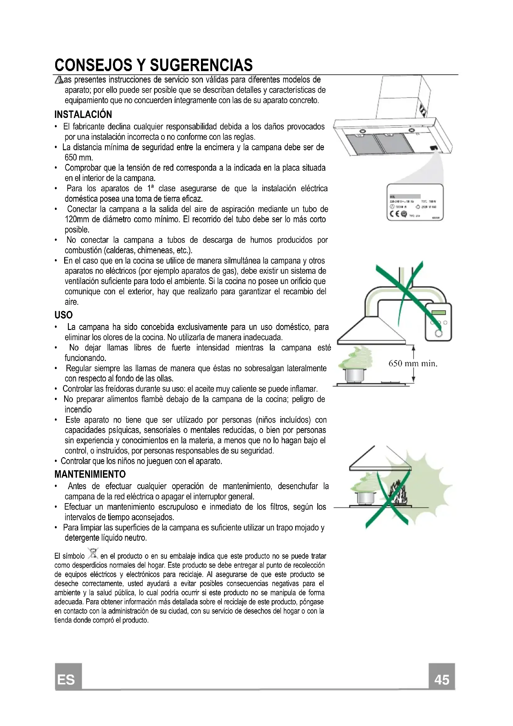 - Para limpiar las superficies de la campana es suficiente utilizar un trapo mojado y detergente líquido neutro. El símbolo en el producto o en su embalaje indica que este producto no se puede tratar como desperdicios normales del hogar. Este producto se debe entregar al punto de recolección de equipos eléctricos y electrónicos para reciclaje. Al asegurarse de que este producto se deseche correctamente, usted ayudará a evitar posibles consecuencias negativas para el ambiente y la salud pública, lo cual podría ocurrir si este producto no se manipula de forma adecuada. Para obtener información más detallada sobre el reciclaje de este producto, póngase en contacto con la administración de su ciudad, con su servicio de desechos del hogar o con la tienda donde compró el producto. 650 mm min.ES