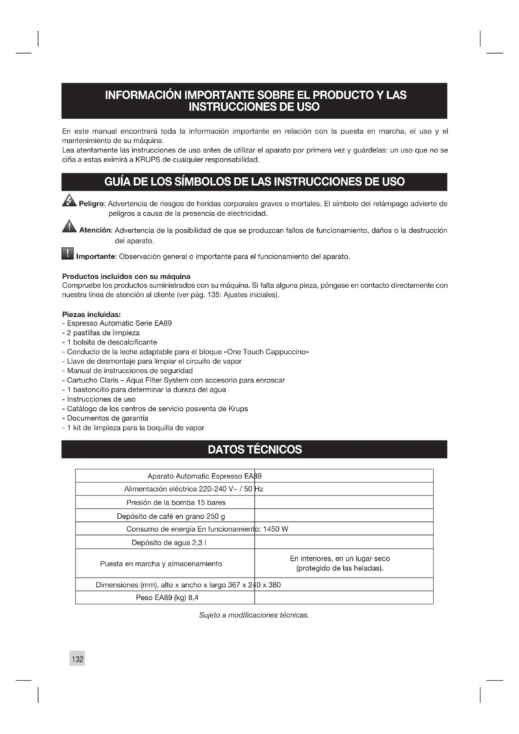 Importante: Observación general o importante para el funcionamiento del aparato. Productos incluidos con su máquina Compruebe los productos suministrados con su máquina. Si falta alguna pieza, póngase en contacto directamente con nuestra línea de atención al cliente (ver pág. 135: Ajustes iniciales). Piezas incluidas: - Espresso Automatic Serie EA89 - 2 pastillas de limpieza - 1 bolsita de descalcicante - Conducto de la leche adaptable para el bloque «One Touch Cappuccino» - Llave de desmontaje para limpiar el circuito de vapor - Manual de instrucciones de seguridad - Cartucho Claris – Aqua Filter System con accesorio para enroscar - 1 bastoncillo para determinar la dureza del agua - Instrucciones de uso - Catálogo de los centros de servicio posventa de Krups - Documentos de garantía - 1 kit de limpieza para la boquilla de vapor