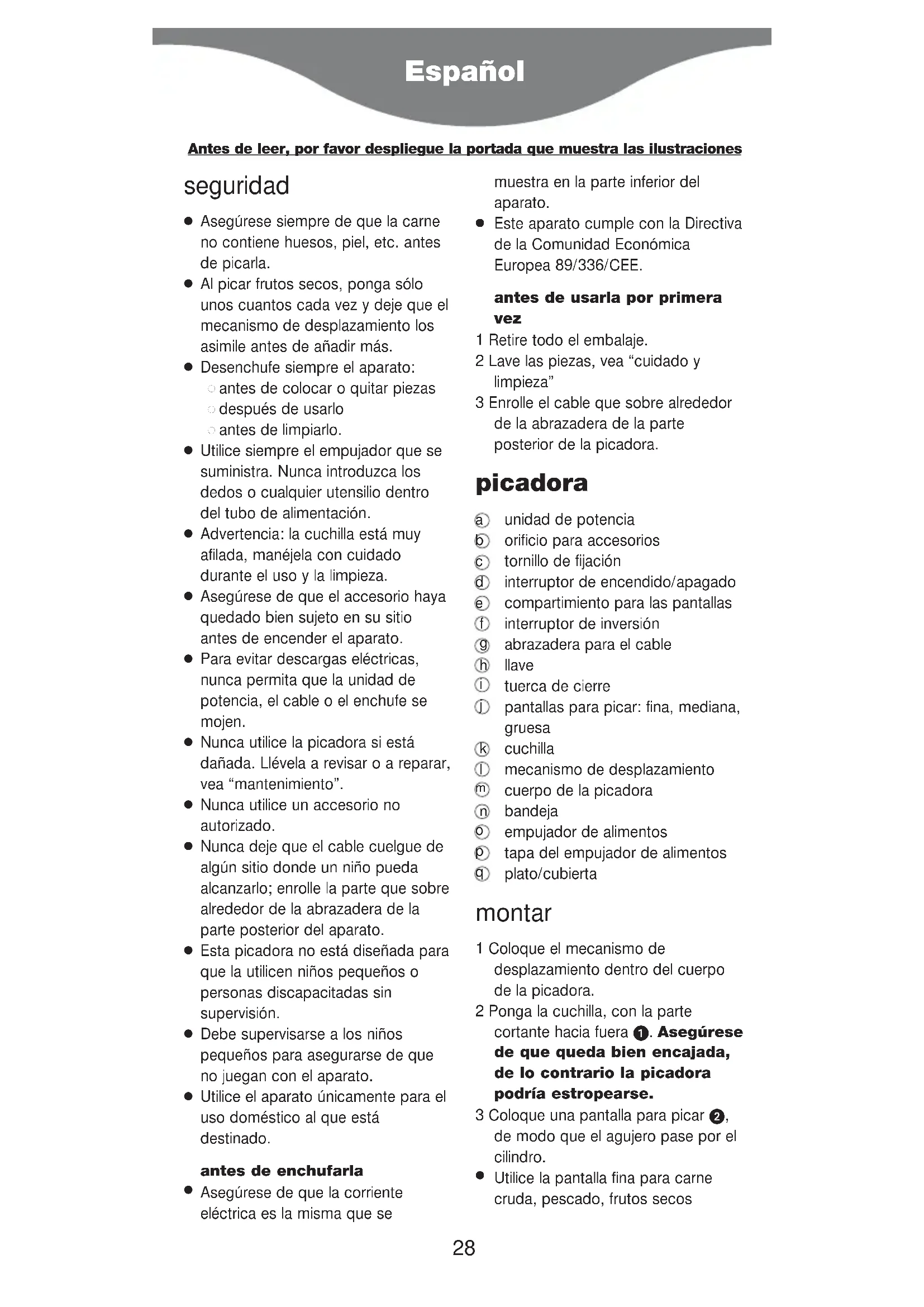 Este aparato cumple con la Directiva de la Comunidad Económica Europea 89/336/CEE. antes de usarla por primera vez 1 Retire todo el embalaje. 2 Lave las piezas, vea “cuidado y limpieza” 3 Enrolle el cable que sobre alrededor de la abrazadera de la parte posterior de la picadora. picadora unidad de potencia orificio para accesorios tornillo de fijación interruptor de encendido/apagado compartimiento para las pantallas interruptor de inversión abrazadera para el cable llave tuerca de cierre pantallas para picar: fina, mediana, gruesa cuchilla mecanismo de desplazamiento cuerpo de la picadora bandeja empujador de alimentos tapa del empujador de alimentos plato/cubierta montar 1 Coloque el mecanismo de desplazamiento dentro del cuerpo de la picadora. 2 Ponga la cuchilla, con la parte cortante hacia fuera . Asegúrese de que queda bien encajada, de lo contrario la picadora podría estropearse. 3 Coloque una pantalla para picar , de modo que el agujero pase por el cilindro.