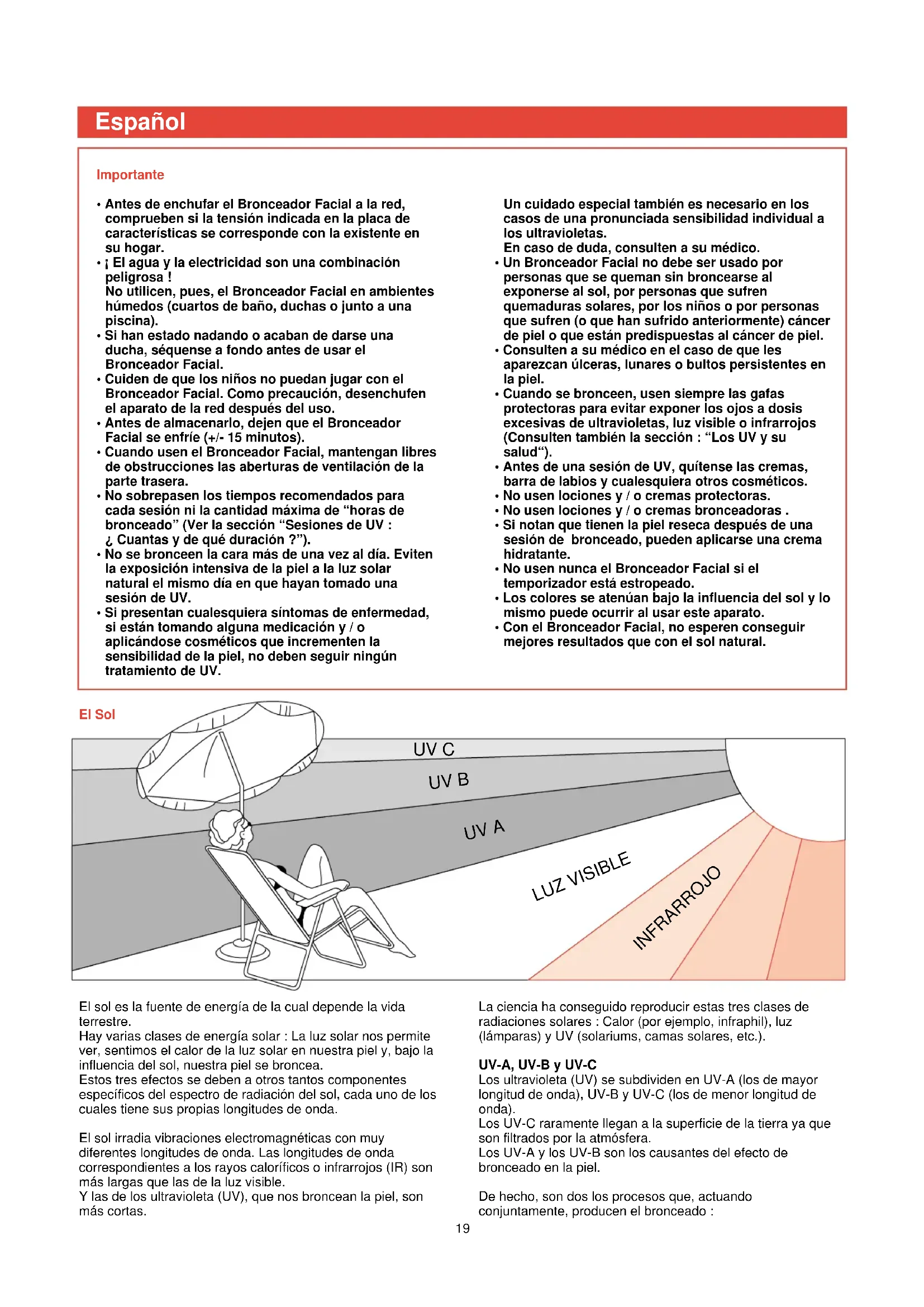 - Durante el año, pueden tomar 7 de esos tratamientos (Ya que 7 x 235 minutos = 1.645 minutos). En la tabla puede verse que la primera sesión de un tratamiento debe tener una duración de 10 minutos, independientemente de la sensibilidad individual de la piel. - Bronceado indirecto . Los UV-B estimulan primordialmente la producción de una substancia llamada Melanina, necesaria para el bronceado. El efecto no aparece hasta un par de días después del baño de sol. - Bronceado directo . Los UV-A, y también una parte de la luz visible, ocasionan un moreno más rápido, sin enrojecimientos ni quemaduras. El Bronceador Facial Este Bronceador Facial emite, predominantemente, UV-A y también una muy pequeña cantidad de UV-B. Los UV y su salud Después de una exposición excesiva a los ultravioleta (ya sean del sol natural o de su Bronceador Facial), en la piel pueden producirse quemaduras solares. Además de otros muchos factores, tales como una exposición excesiva al sol natural, el uso impropio y excesivo de su Bronceador Facial aumentará el riesgo de enfermedades cutáneas y oculares. La naturaleza, intensidad y duración de la radiación, por un lado, y la sensibilidad de cada uno, por otro, son decisivas en el grado en que pueden darse esos efectos. Cuanto más la piel y los ojos estén expuestos a los UV, más se incrementa el riesgo de enfermedades tales como inflamación de la córnea y / o conjuntivitis, daños en la retina, cataratas, envejecimiento prematuro de la piel y tumores cutáneos. Ciertas medicinas y cosméticos aumentan la sensibilidad a los UV. Por ello, es de la mayor importancia : - Que sigan las instrucciones dadas en las secciones “Importante” y “Sesiones de UV : ¿ Cuántas y de qué duración ?”. - Que seleccionen la aconsejada distancia operacional de 10 cm. - Que no excedan la cantidad máxima admisible de horas de bronceado anuales (Por ejemplo, 30 horas ó 1.800 minu- tos). - Que, al broncearse, se usen siempre las gafas protectoras que se suministran.
