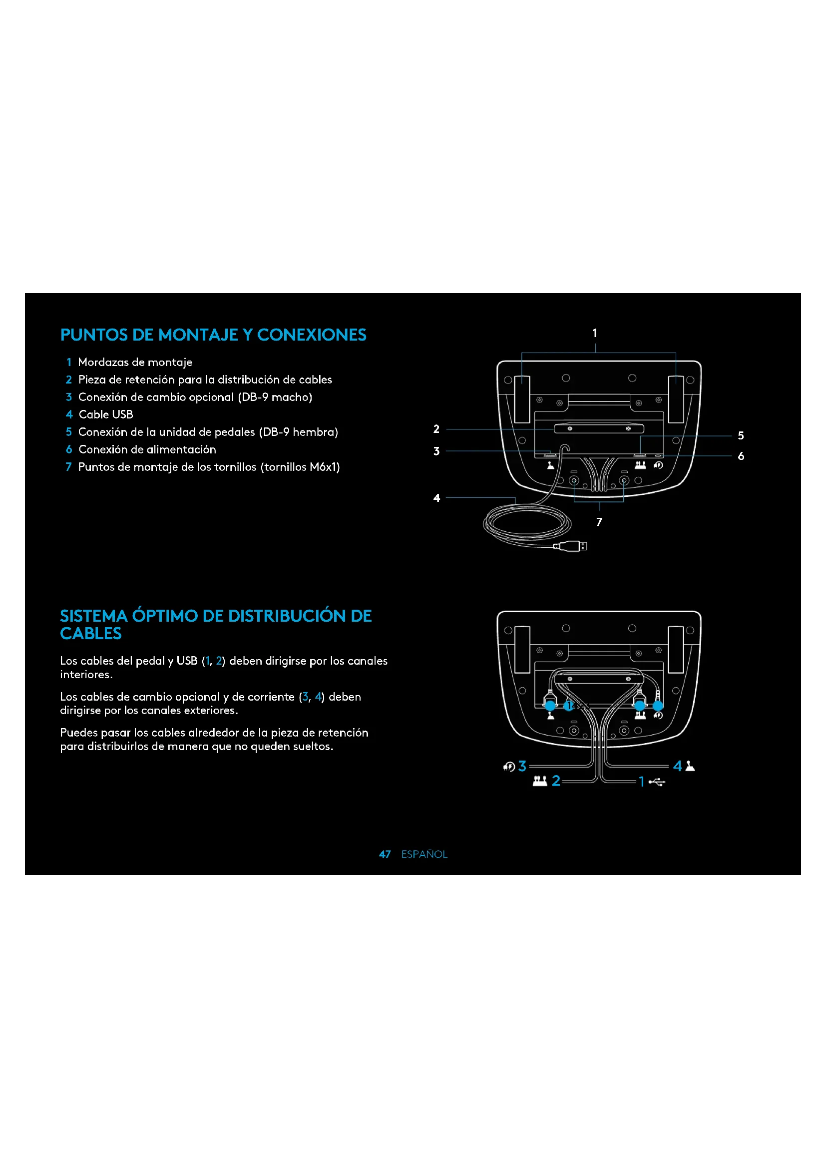 1 Mordazas de montaje 2 Pieza de retención para la distribución de cables 3 Conexión de cambio opcional (DB-9 macho) 4 Cable USB 5 Conexión de la unidad de pedales (DB-9 hembra) 6 Conexión de alimentación 7 Puntos de montaje de los tornillos (tornillos M6x1)