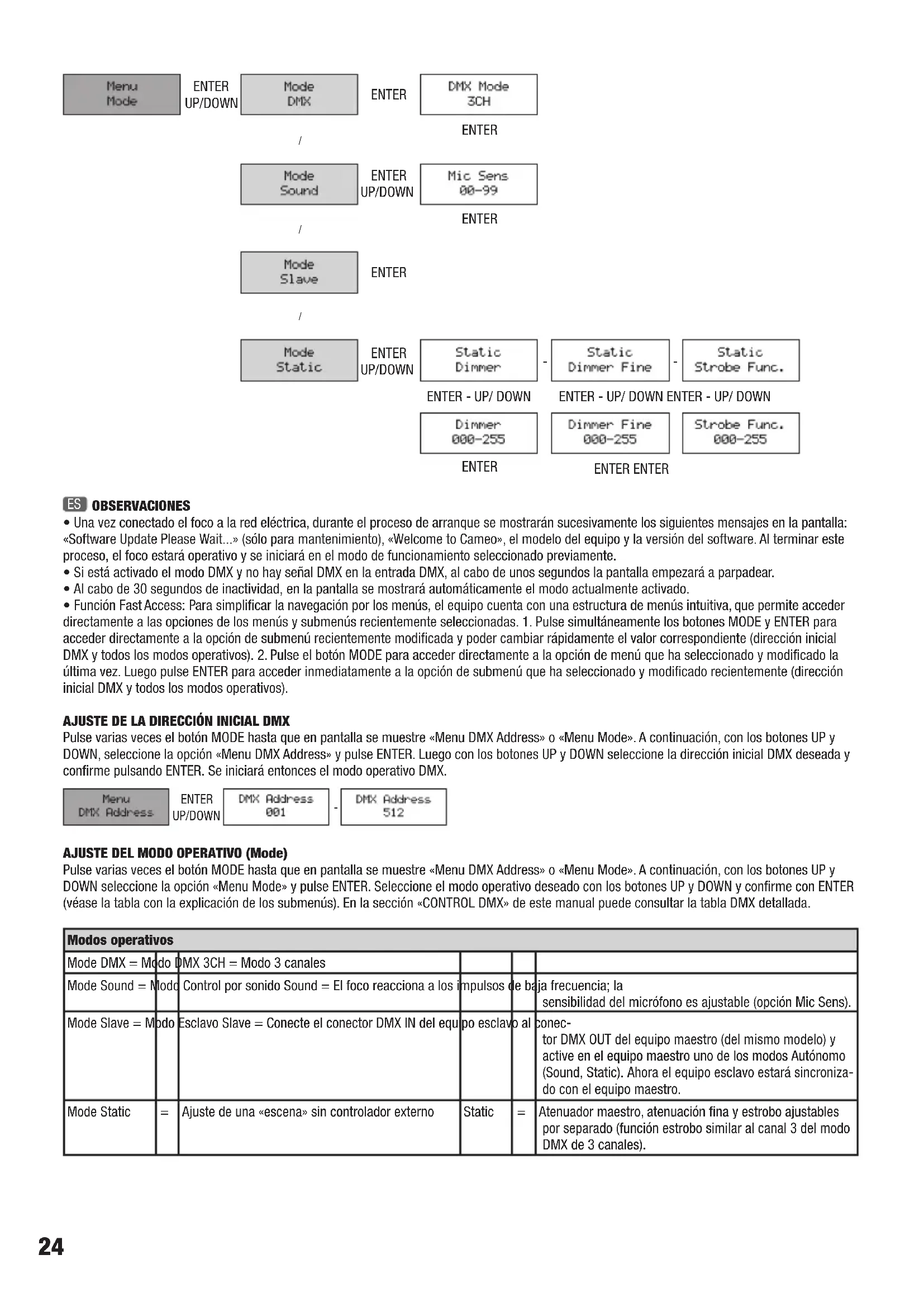 - Funcion Fast Access: Para simplificar la navigacion por los menus, el equipo cuenta con una estrctura de menus intuitiva, que permite acceder directamente a las options de los menus y submenus recentamente selec tionadas. 1. Pulse simultaneamente los botones MODE y ENTER para acceder directamente a la option de submenu recentamente modifica y poder embar rapidamente el valor correspondiente (direccion inicia DMX y todos losculos operativos). 2. Pulse el boton MODE para acceder directamente a la option de menu que ha selectionado y modifieda la ultima vez. Luego pulse ENTER para acceder inmediatamente a la option de submenue que ha selectionado y modified recientmente (direcion inicia DMX y todos losculos operativos).