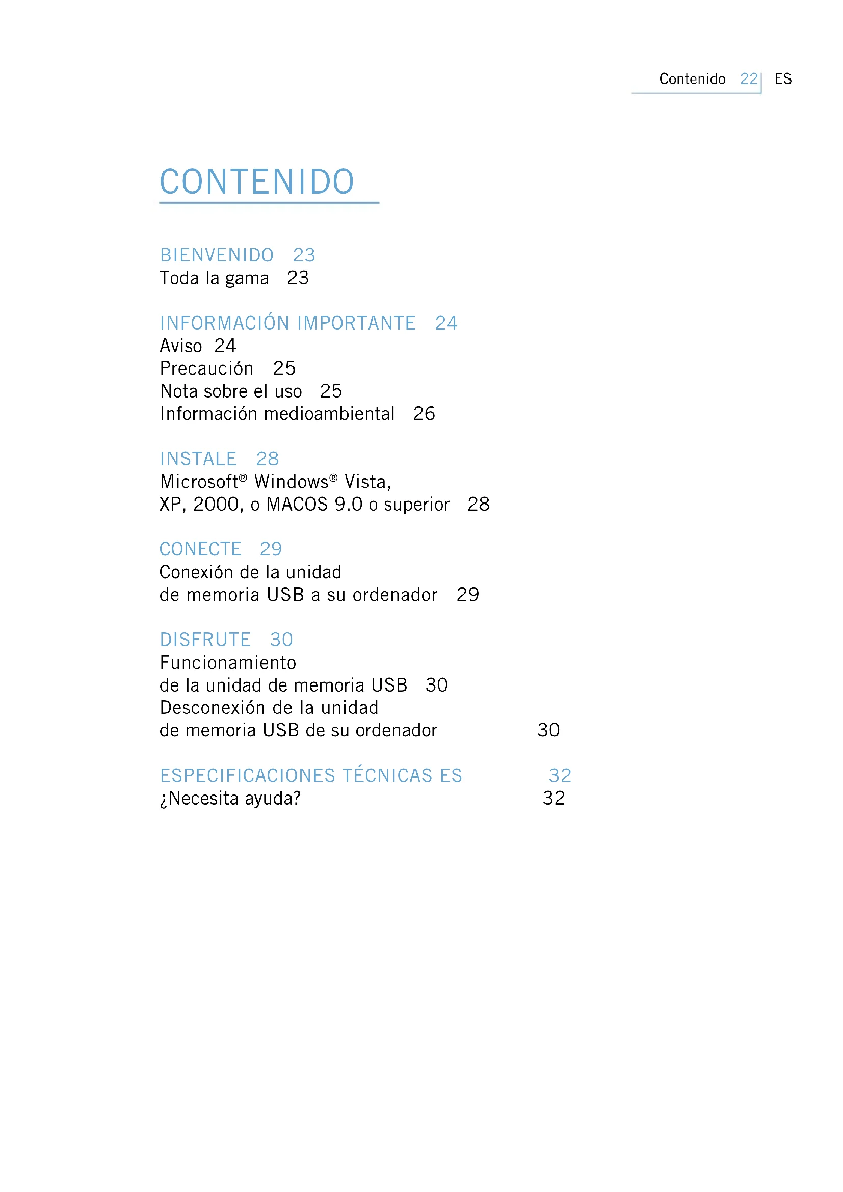 Vista, XP, 2000, o MACOS 9.0 o superior 28 CONECTE 29 Conexión de la unidad de memoria USB a su ordenador 29 DISFRUTE 30 Funcionamiento de la unidad de memoria USB 30 Desconexión de la unidad de memoria USB de su ordenador 30