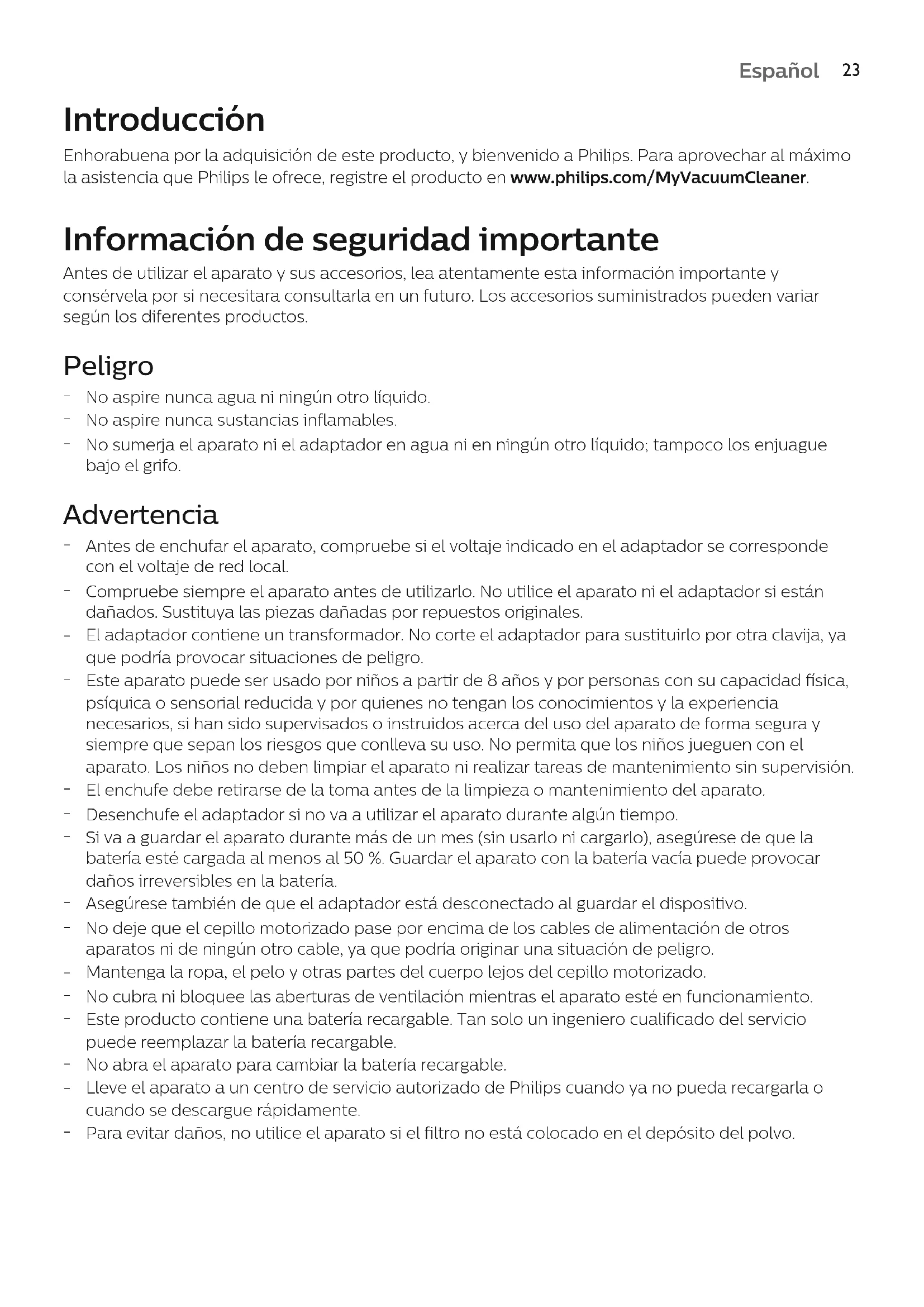 Español Introducción Enhorabuena por la adquisición de este producto, y bienvenido a Philips. Para aprovechar al máximo la asistencia que Philips le ofrece, registre el producto en www.philips.com/MyVacuumCleaner. Información de seguridad importante Antes de utilizar el aparato y sus accesorios, lea atentamente esta información importante y consérvela por si necesitara consultarla en un futuro. Los accesorios suministrados pueden variar según los diferentes productos. Peligro