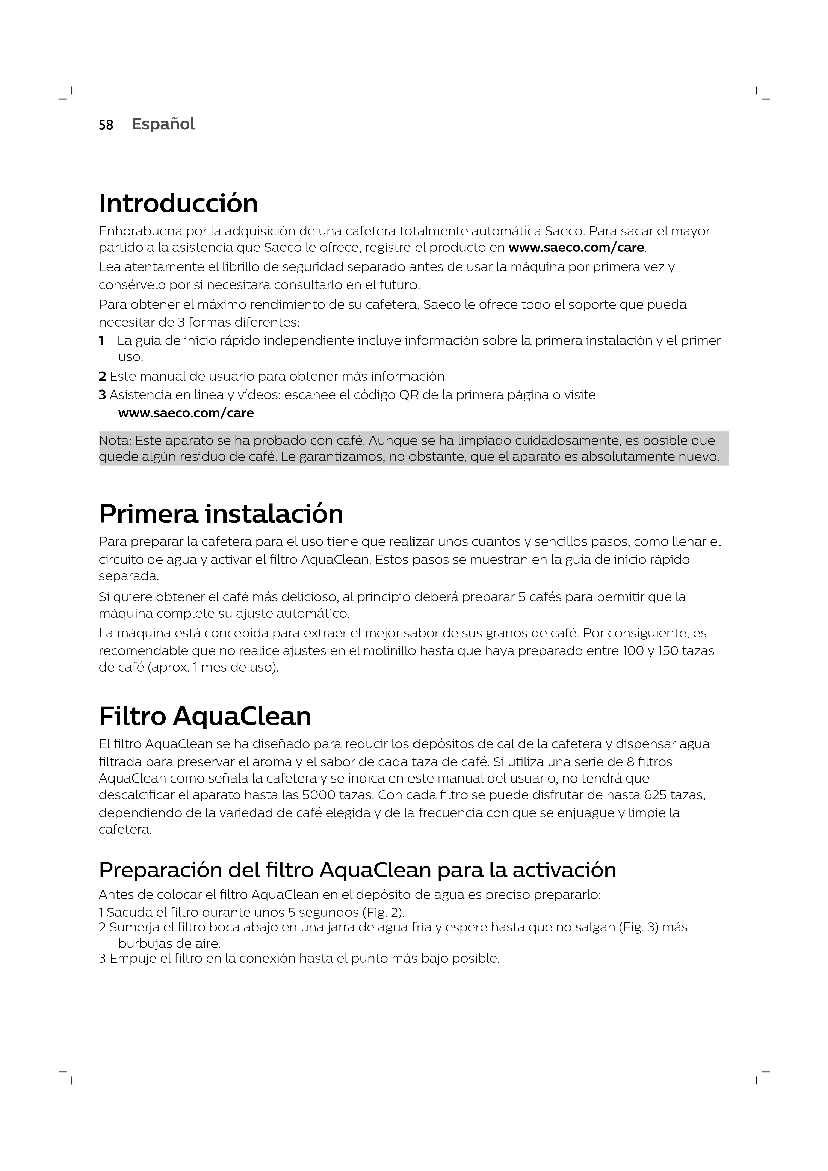 Español 16 Interior de la puerta de mantenimiento con instrucciones de limpieza 17 Conducto de salida del caféIntroducción Enhorabuena por la adquisición de una cafetera totalmente automática Saeco. Para sacar el mayor partido a la asistencia que Saeco le ofrece, registre el producto en www.saeco.com/care. Lea atentamente el librillo de seguridad separado antes de usar la máquina por primera vez y consérvelo por si necesitara consultarlo en el futuro. Para obtener el máximo rendimiento de su cafetera, Saeco le ofrece todo el soporte que pueda necesitar de 3 formas diferentes: 1 La guía de inicio rápido independiente incluye información sobre la primera instalación y el primer uso. 2 Este manual de usuario para obtener más información 3 Asistencia en línea y vídeos: escanee el código QR de la primera página o visite www.saeco.com/care Nota: Este aparato se ha probado con café. Aunque se ha limpiado cuidadosamente, es posible que quede algún residuo de café. Le garantizamos, no obstante, que el aparato es absolutamente nuevo. Primera instalación Para preparar la cafetera para el uso tiene que realizar unos cuantos y sencillos pasos, como llenar el circuito de agua y activar el filtro AquaClean. Estos pasos se muestran en la guía de inicio rápido separada. Si quiere obtener el café más delicioso, al principio deberá preparar 5 cafés para permitir que la máquina complete su ajuste automático. La máquina está concebida para extraer el mejor sabor de sus granos de café. Por consiguiente, es recomendable que no realice ajustes en el molinillo hasta que haya preparado entre 100 y 150 tazas de café (aprox. 1 mes de uso). Filtro AquaClean El filtro AquaClean se ha diseñado para reducir los depósitos de cal de la cafetera y dispensar agua filtrada para preservar el aroma y el sabor de cada taza de café. Si utiliza una serie de 8 filtros AquaClean como señala la cafetera y se indica en este manual del usuario, no tendrá que descalcificar el aparato hasta las 5000 tazas. Con cada filtro se puede disfrutar de hasta 625 tazas, dependiendo de la variedad de café elegida y de la frecuencia con que se enjuague y limpie la cafetera. Preparación del filtro AquaClean para la activación Antes de colocar el filtro AquaClean en el depósito de agua es preciso prepararlo: 1 Sacuda el filtro durante unos 5 segundos (Fig. 2). 2 Sumerja el filtro boca abajo en una jarra de agua fría y espere hasta que no salgan (Fig. 3) más burbujas de aire. 3 Empuje el filtro en la conexión hasta el punto más bajo posible.