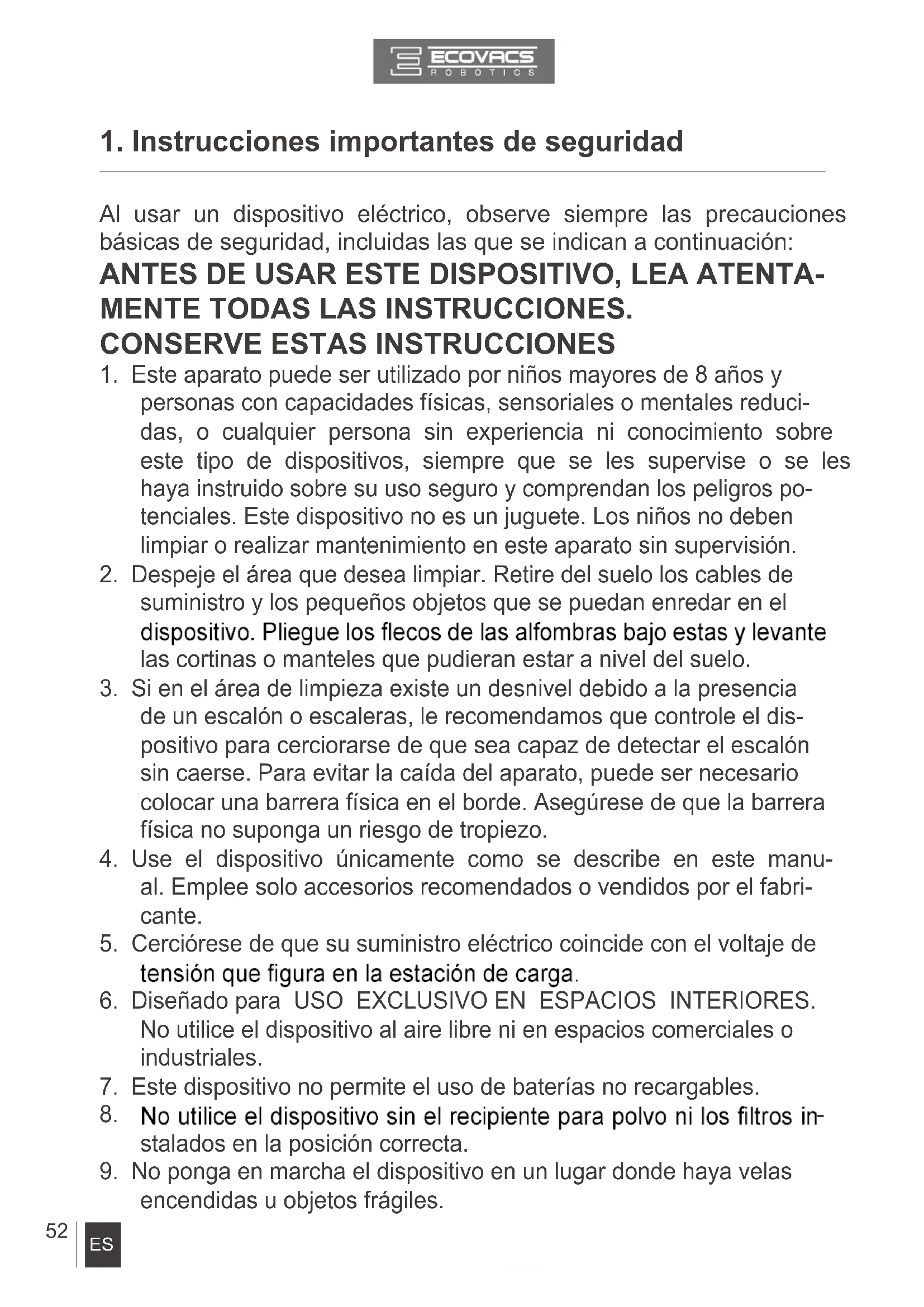 al de usuario. ECOVACS ROBOTICS no asume ninguna responsa- bilidad por los daños o lesiones causados por un uso inadecuado.