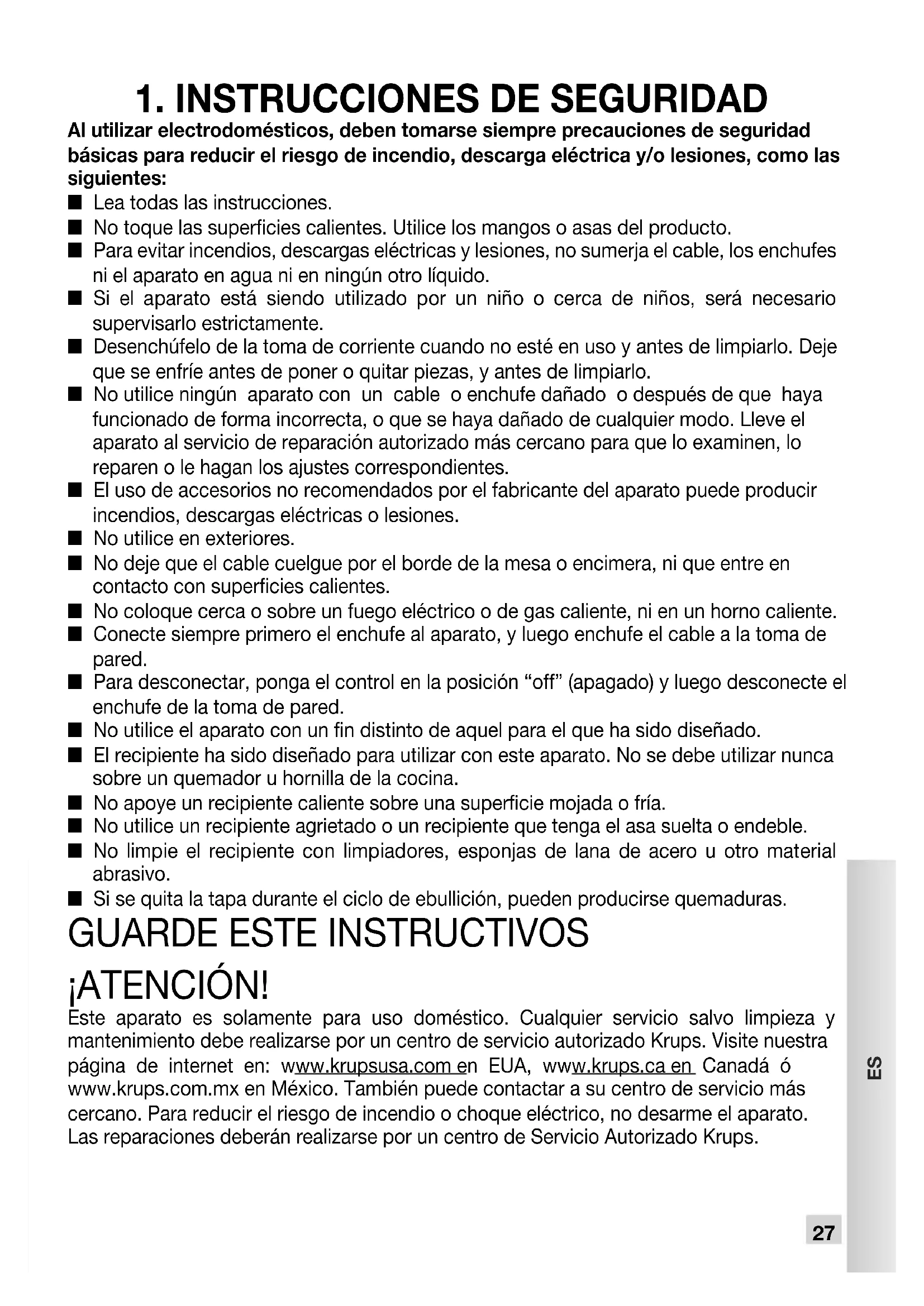 ¡ATENCIÓN! Este aparato es solamente para uso doméstico. Cualquier servicio salvo limpieza y mantenimiento debe realizarse por un centro de servicio autorizado Krups. Visite nuestra página de internet en: www.krupsusa.com en EUA, www.krups.ca en Canadá ó www.krups.com.mx en México. También puede contactar a su centro de servicio más cercano. Para reducir el riesgo de incendio o choque eléctrico, no desarme el aparato. Las reparaciones deberán realizarse por un centro de Servicio Autorizado Krups. KR_CAFETIERE_EC322_M1_NAFTA_NC00142207_01_Mise en page 1 24/11/2017 11:00 Page2728