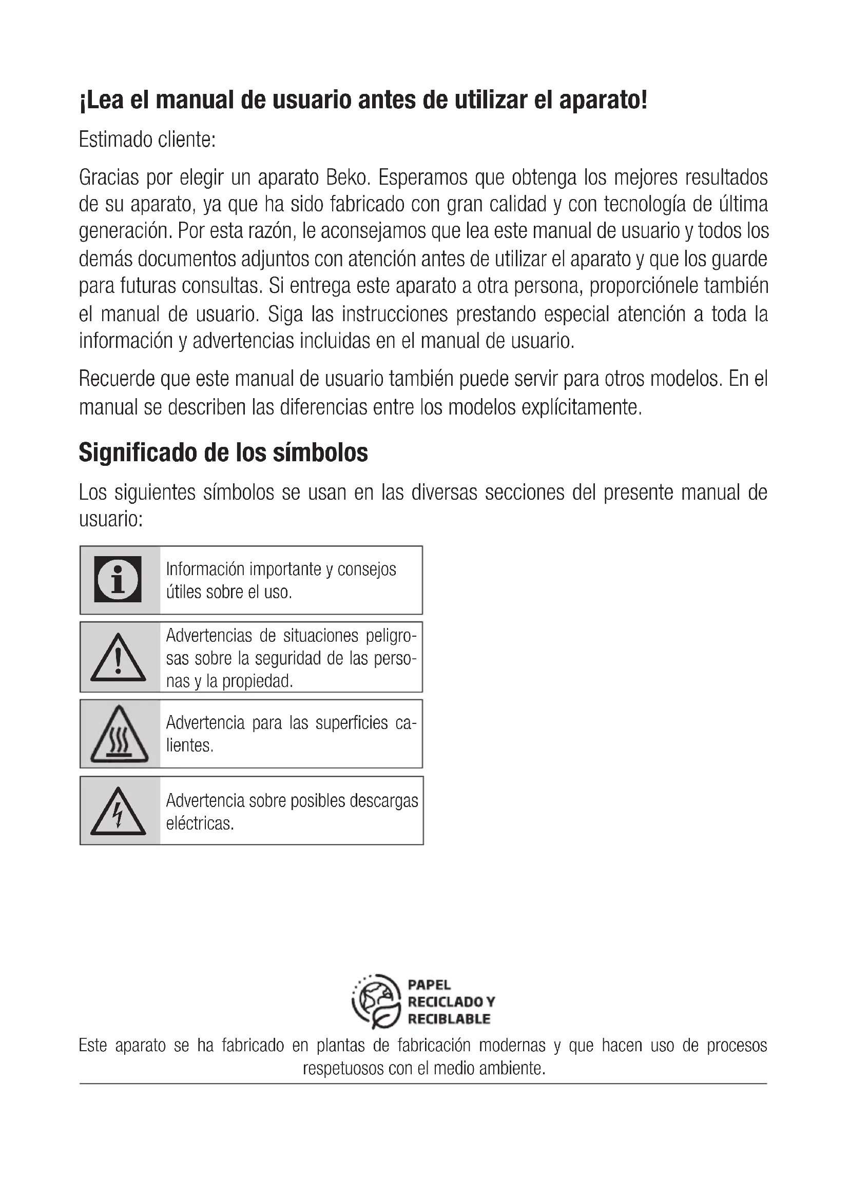 Diese Garantiezusage ist nur gültig innerhalb der Bundesrepublik Deutschland Garantiebedingungen - Beko – Version Februar 2021¡Lea el manual de usuario antes de utilizar el aparato! Estimado cliente: Gracias por elegir un aparato Beko. Esperamos que obtenga los mejores resultados de su aparato, ya que ha sido fabricado con gran calidad y con tecnología de última generación. Por esta razón, le aconsejamos que lea este manual de usuario y todos los demás documentos adjuntos con atención antes de utilizar el aparato y que los guarde para futuras consultas. Si entrega este aparato a otra persona, proporciónele también el manual de usuario. Siga las instrucciones prestando especial atención a toda la información y advertencias incluidas en el manual de usuario. Recuerde que este manual de usuario también puede servir para otros modelos. En el manual se describen las diferencias entre los modelos explícitamente. Significado de los símbolos Los siguientes símbolos se usan en las diversas secciones del presente manual de usuario:
