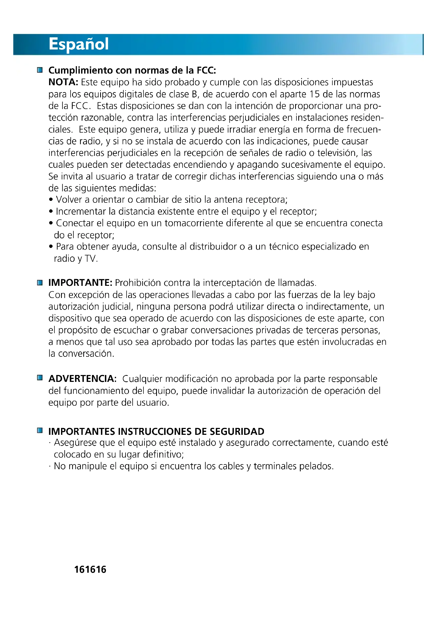 - Paraobtenerayuda,consultealdistribuidoroauntécnicoespecializadoen radio y TV. IMPORTANTE: Prohibición contra la interceptación de llamadas. Con excepción de las operaciones llevadas a cabo por las fuerzas de la ley bajo autorización judicial, ninguna persona podrá utilizar directa o indirectamente, un dispositivo que sea operado de acuerdo con las disposiciones de este aparte, con el propósito de escuchar o grabar conversaciones privadas de terceras personas, a menos que tal uso sea aprobado por todas las partes que estén involucradas en la conversación. ADVERTENCIA: Cualquier modificación no aprobada por la parte responsable del funcionamiento del equipo, puede invalidar la autorización de operación del equipo por parte del usuario.