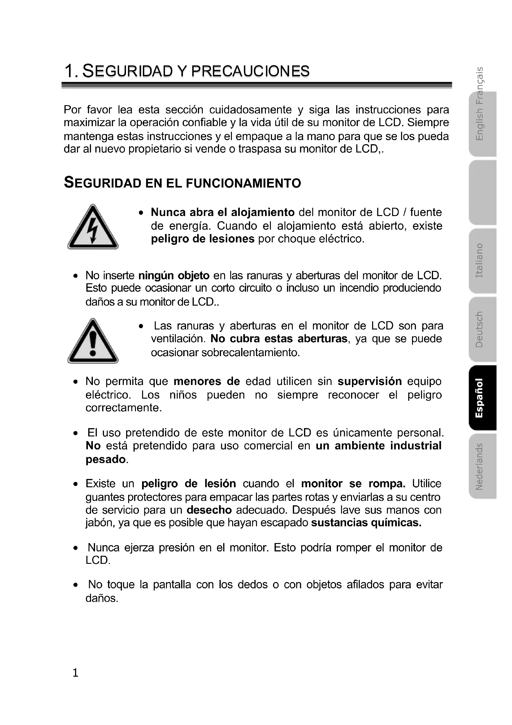 Por favor lea esta sección cuidadosamente y siga las instrucciones para maximizar la operación confiable y la vida útil de su monitor de LCD. Siempre mantenga estas instrucciones y el empaque a la mano para que se los pueda dar al nuevo propietario si vende o traspasa su monitor de LCD,.