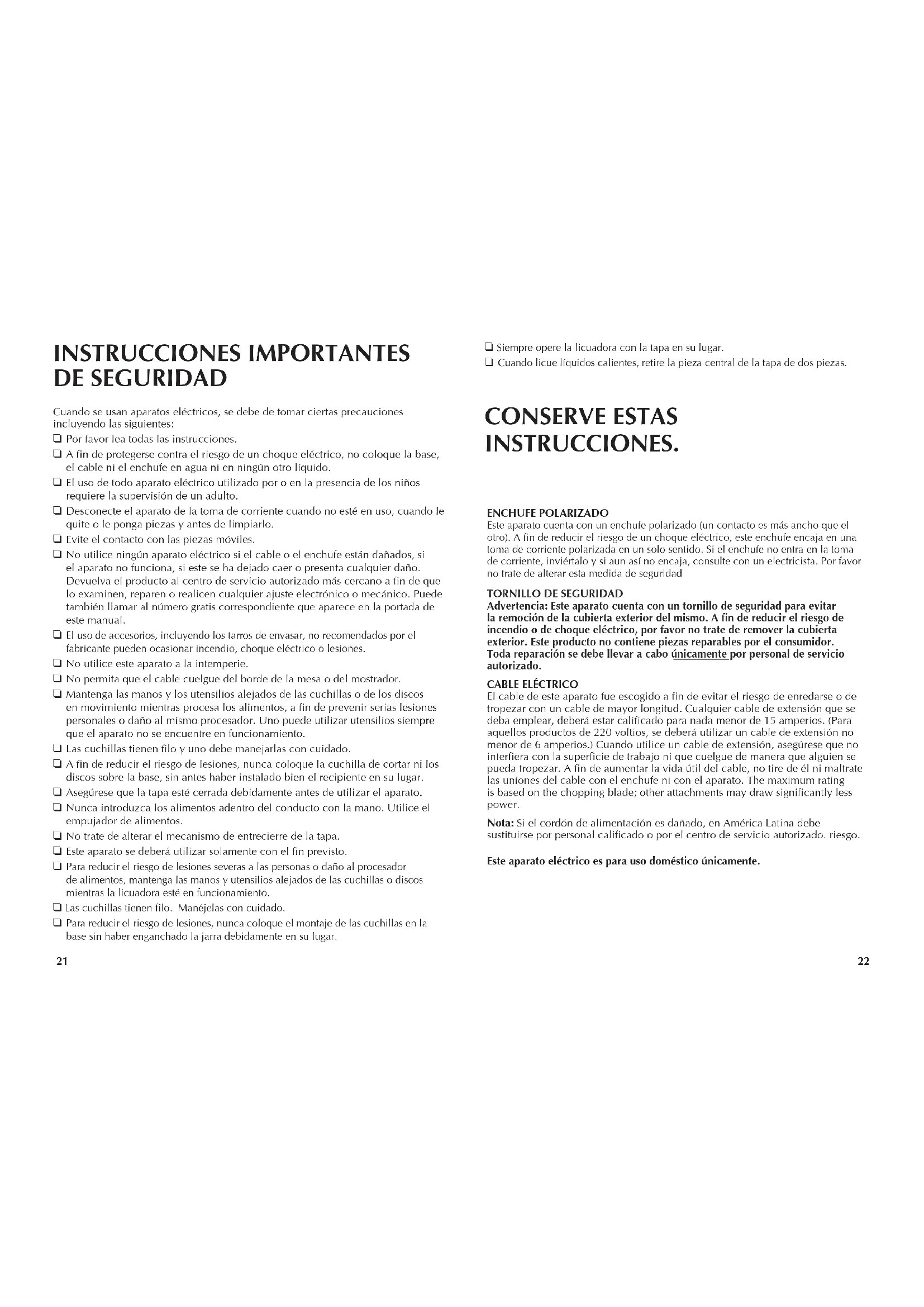 Este aparato se deberá utilizar solamente con el fin previsto. ❑ Para reducir el riesgo de lesiones severas a las personas o daño al procesador de alimentos, mantenga las manos y utensilios alejados de las cuchillas o discos mientras la licuadora esté en funcionamiento. ❑ Las cuchillas tienen filo. Manéjelas con cuidado. ❑ Para reducir el riesgo de lesiones, nunca coloque el montaje de las cuchillas en la base sin haber enganchado la jarra debidamente en su lugar. INSTRUCCIONESIMPORTANTES DESEGURIDAD ENCHUFEPOLARIZADO Este aparato cuenta con un enchufe polarizado (un contacto es más ancho que el otro). A fin de reducir el riesgo de un choque eléctrico, este enchufe encaja en una toma de corriente polarizada en un solo sentido. Si el enchufe no entra en la toma de corriente, inviértalo y si aun así no encaja, consulte con un electricista. Por favor no trate de alterar esta medida de seguridad TORNILLODESEGURIDAD Advertencia:Esteaparatocuentaconuntornillodeseguridadparaevitar laremocióndelacubiertaexteriordelmismo.Afindereducirelriesgode incendioodechoqueeléctrico,porfavornotratederemoverlacubierta exterior.Esteproductonocontienepiezasreparablesporelconsumidor. Todareparaciónsedebellevaracaboúnicamenteporpersonaldeservicio autorizado. CABLEELÉCTRICO El cable de este aparato fue escogido a fin de evitar el riesgo de enredarse o de tropezar con un cable de mayor longitud. Cualquier cable de extensión que se deba emplear, deberá estar calificado para nada menor de 15 amperios. (Para aquellos productos de 220 voltios, se deberá utilizar un cable de extensión no menor de 6 amperios.) Cuando utilice un cable de extensión, asegúrese que no interfiera con la superficie de trabajo ni que cuelgue de manera que alguien se pueda tropezar. A fin de aumentar la vida útil del cable, no tire de él ni maltrate las uniones del cable con el enchufe ni con el aparato. The maximum rating is based on the chopping blade; other attachments may draw significantly less power. Nota:Si el cordón de alimentación es dañado, en América Latina debe sustituirse por personal calificado o por el centro de servicio autorizado. riesgo. Esteaparatoeléctricoesparausodomésticoúnicamente. CONSERVEESTAS INSTRUCCIONES. ❑ Siempre opere la licuadora con la tapa en su lugar. ❑ Cuando licue líquidos calientes, retire la pieza central de la tapa de dos piezas.INTRODUCCIÓN Muchas gracias por escoger el procesador para alimentos de boca amplia y 10 tazas Black & Decker® de Power Pro®.