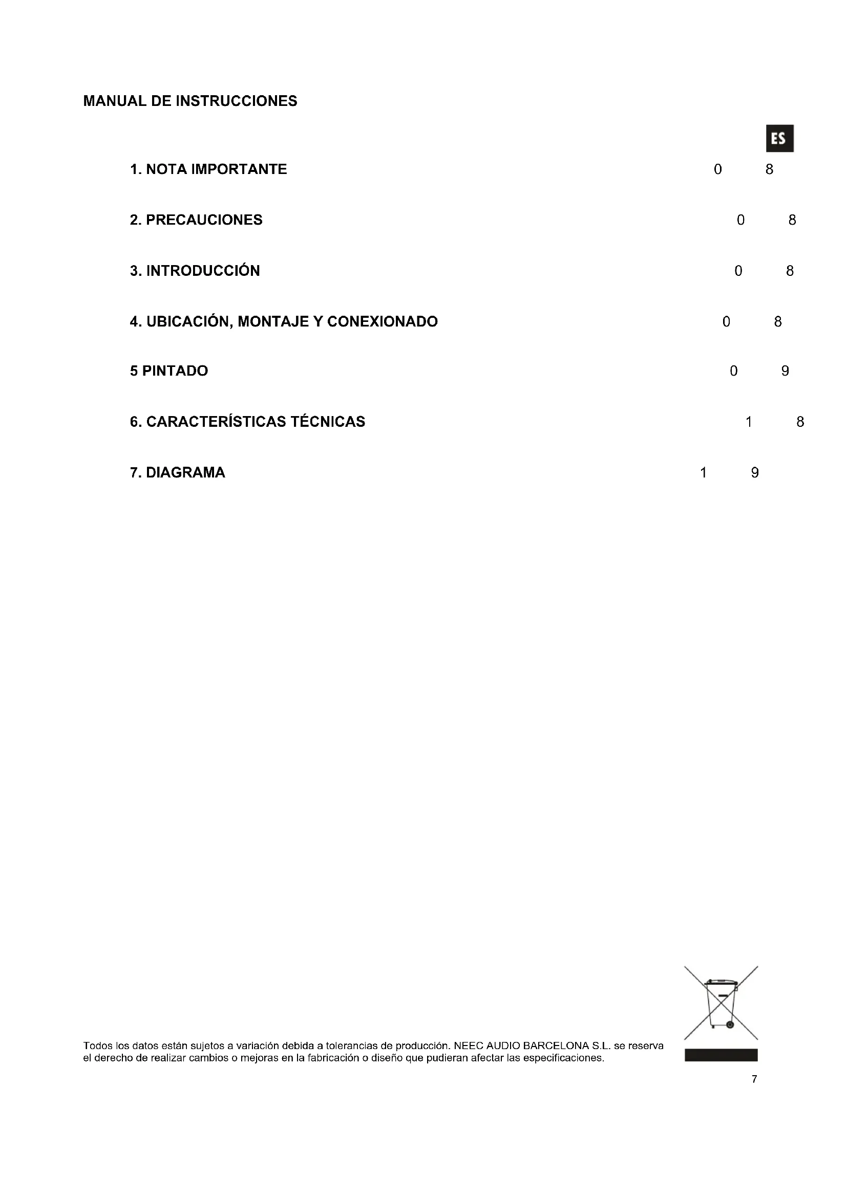 Todos los datos están sujetos a variación debida a tolerancias de producción. NEEC AUDIO BARCELONA S.L. se reserva el derecho de realizar cambios o mejoras en la fabricación o diseño que pudieran afectar las especificaciones.8