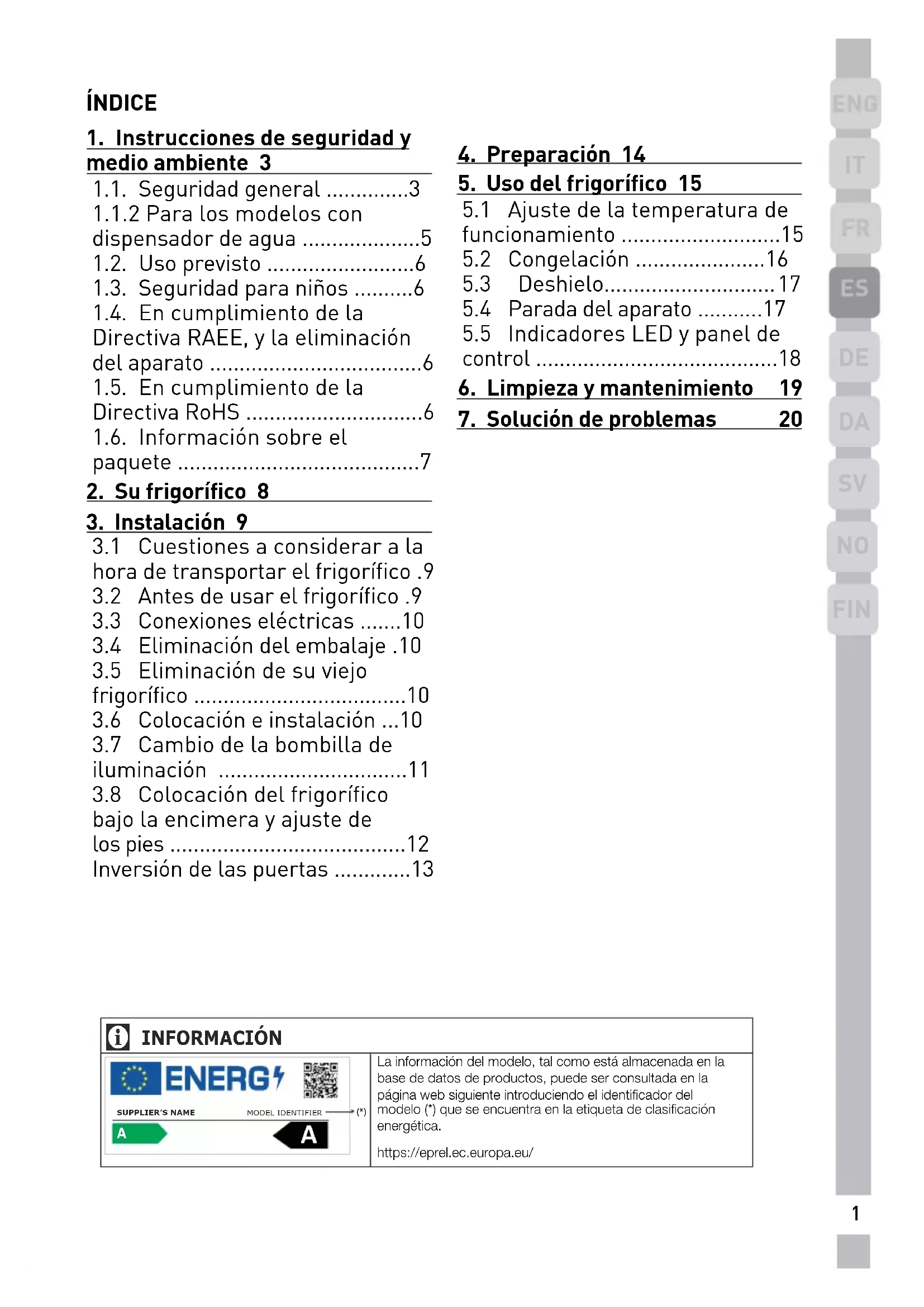 ÍNDICE INFORMACIÓN La información del modelo, tal como está almacenada en la base de datos de productos, puede ser consultada en la página web siguiente introduciendo el identificador del modelo (*) que se encuentra en la etiqueta de clasificación energética.https://eprel.ec.europa.eu/