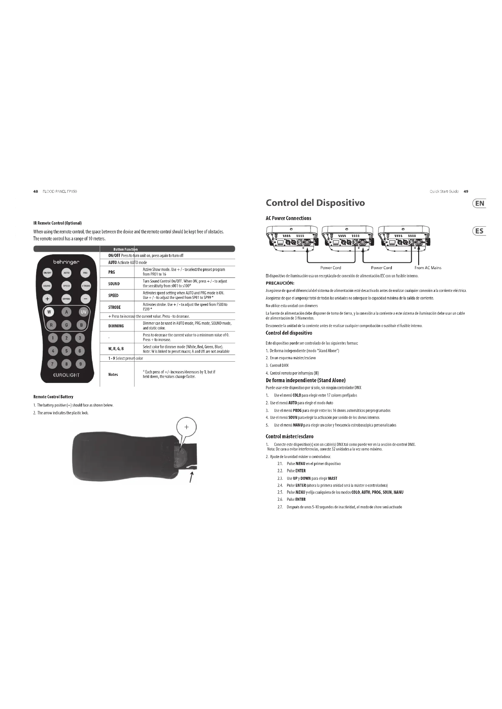 2.1. Pulse MENU en el primer dispositivo 2.2. Pulse ENTER 2.3. Use UP y DOWN para elegir MAST 2.4. Pulse ENTER (ahora la primera unidad será la máster o controladora) 2.5. Pulse MENU y elija cualquiera de los modos COLO, AUTO, PROG, SOUN, MANU 2.6. Pulse ENTER 2.7. Después de unos 5-10 segundos de inactividad, el modo de show será activado Control del Dispositivo Power CordPower Cord From AC Mains50 51Quick Start GuideFLOOD PANEL FP150